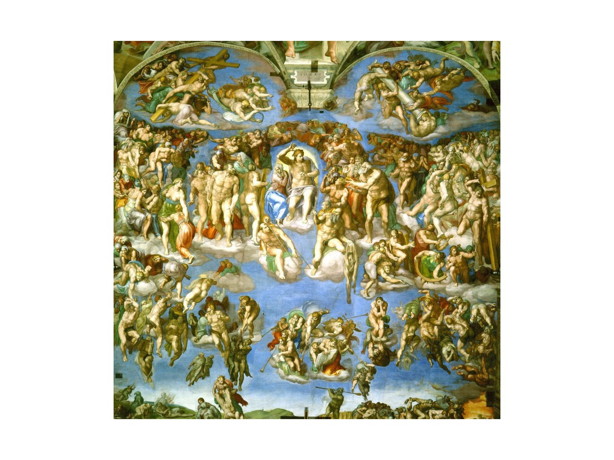 Imaginea reprezintă o pictură celebră numită 'Judgement Day', realizată de Michelangelo Buonarroti. Pictura ilustrează o scenă vastă cu Număroase figuri umane dispuse în diverse poziții, multe dintre ele plasate într-un cadru ce pare a fi cerul. Central în compoziție se află două figuri majore, una dintre ele fiind o reprezentare a lui Iisus, înconjurat de diferite scene din iudaism și creștinism. Figurile exprimă diverse emoții de la suferință la extaz, iar paleta de culori vii accentuează dramatismul și intensitatea momentelor captate.