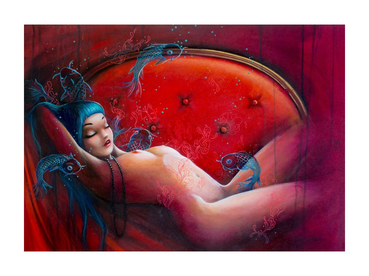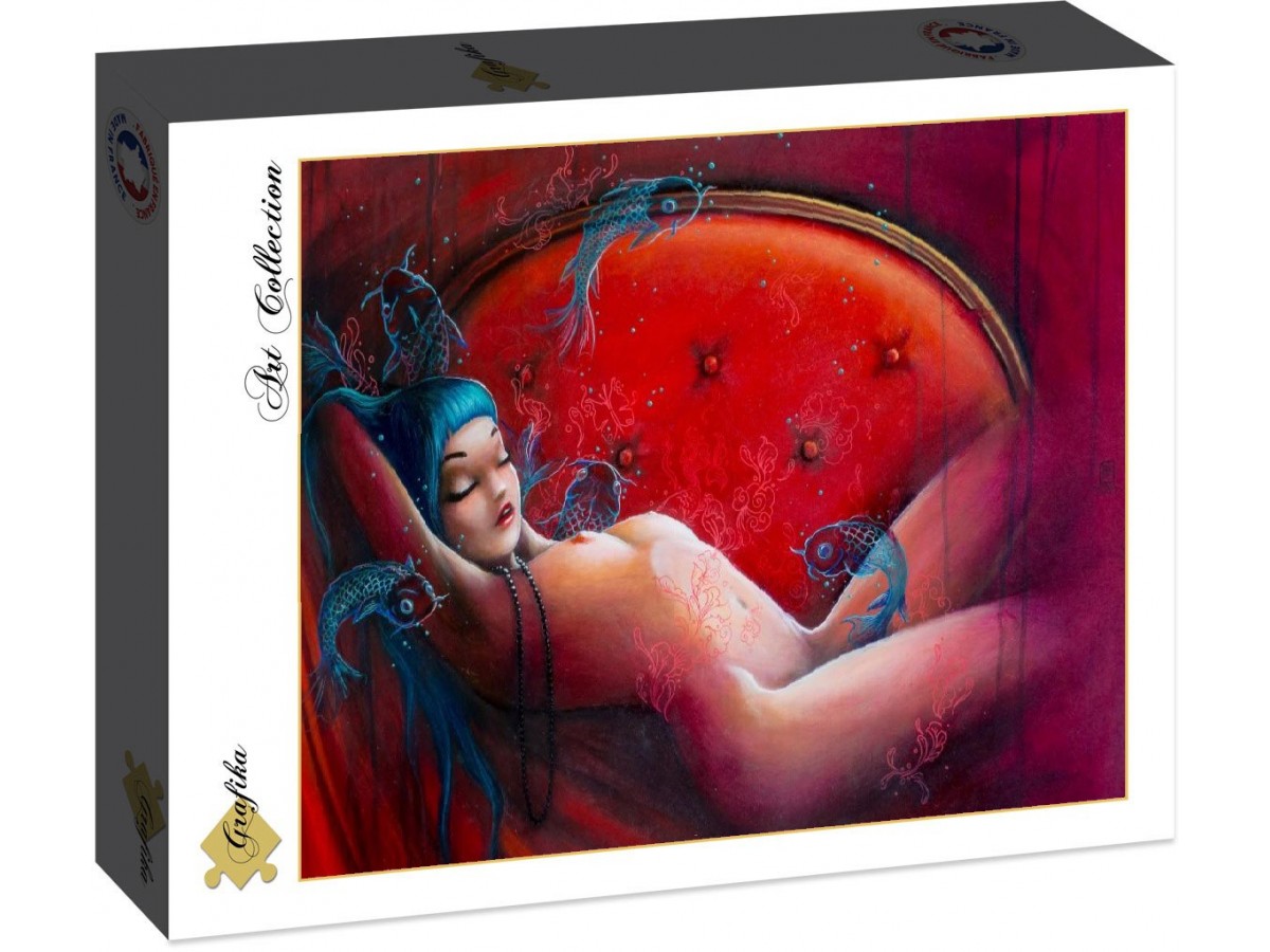 Opera de artă reprezentată în acest puzzle este o pictură ce înfățișează o femeie dormind, culcată într-o canapea roșie cu o formă semicirculară. Părul ei este albastru și bogat în detalii, contrastând cu roșul intens al canapelei și al fundalului. Pe lângă și deasupra ei plutesc trei pești stilizați, colorați în tonuri de albastru și negru, cu elemente decorative roșii pe corp. Acești pești par a fi desenați cu un stil fantastic și emit un sentiment magic. Toată compoziția evocă visarea, serenitatea și intimitatea, elemente tipice pentru lucrările artistei Misstigri, cunoscută pentru abordarea sa vibrantă și sensuală a formelor umane.