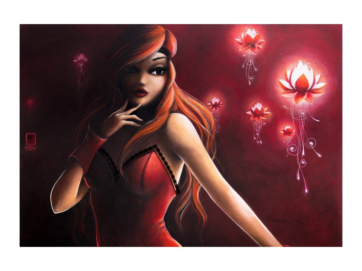 Ilustrația redă o femeie tânără cu părul roșcat, lung, purtând o rochie reducerată, asemănătoare cu un corsaj roșu. Gesticularea ei delicată, atingându-și ușor obrazul, alături de expresia visătoare, adaugă o notă de mister și seducție întregii compoziții. De jur-împrejurul personajului central sunt prezente elemente decorative luminoase, ce par a fi flori stilizate cu lumini pulsătoare, care adaugă un efect de vis și magie scenei. Imaginile florale, combinate cu fundalul roșu intens, creează un contrast puternic și o atmosferă intensă, captivantă.