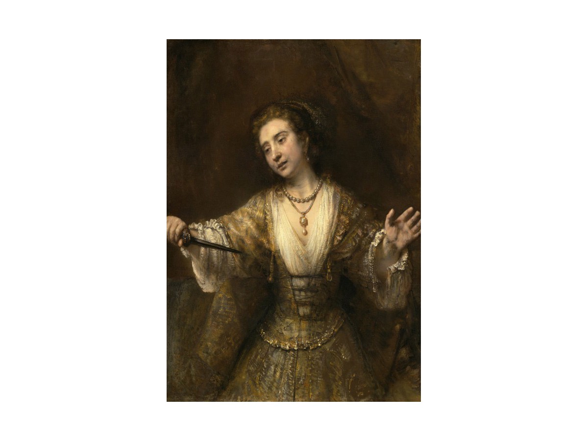 Această pictură numită 'Lucretia', realizată de Rembrandt Van Rijn în anul 1664, prezintă o femeie într-un costum de epocă, ce pare a fi din secolul XVII. Personajul principal, Lucretia, este reprezentată cu o expresie tristă şi gravă, având mâna dreaptă întinsă în care ține un pumnal orientat spre piept. Împărăcată predominant de tonuri de maro şi aurii, această pictură exprimă o intensitate emoțională profundă, înfățișându-i pe cei care o privesc. În fundalul închis, detaliile sunt sumare, permițând astfel concentrarea vizuală în jurul figural central, Lucretia.