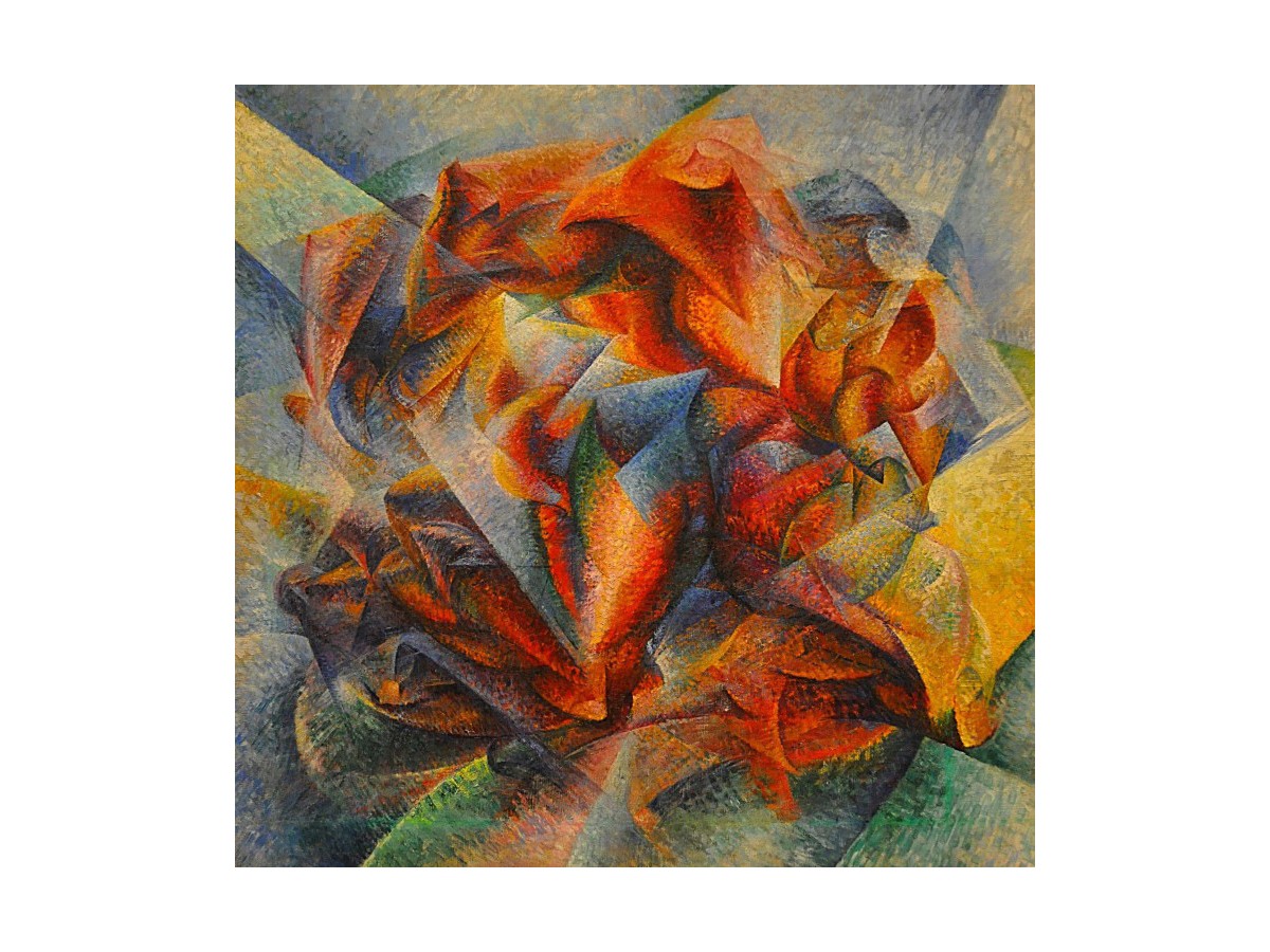 Această pictură, realizată de Umberto Boccioni și intitulată 'Dinamismo di un ciclista', prezintă o abordare vibrantă și energică, specifică stilului futurist, ce explorează mișcarea și dinamica. Imaginea ilustrează, prin forme și culori intersectate, impulsul și viteza, captând esența mișcării unui ciclist. Compoziția utilizată de Boccioni este plină de unghiuri ascuțite și culori puternice care par să irumpă din centrul lucrării, dând o senzație de viteză și forță. Culorile predominante includ nuanțe de portocaliu, roșu și albastru, care sunt folosite pentru a accentua intensitatea și energia scenei.