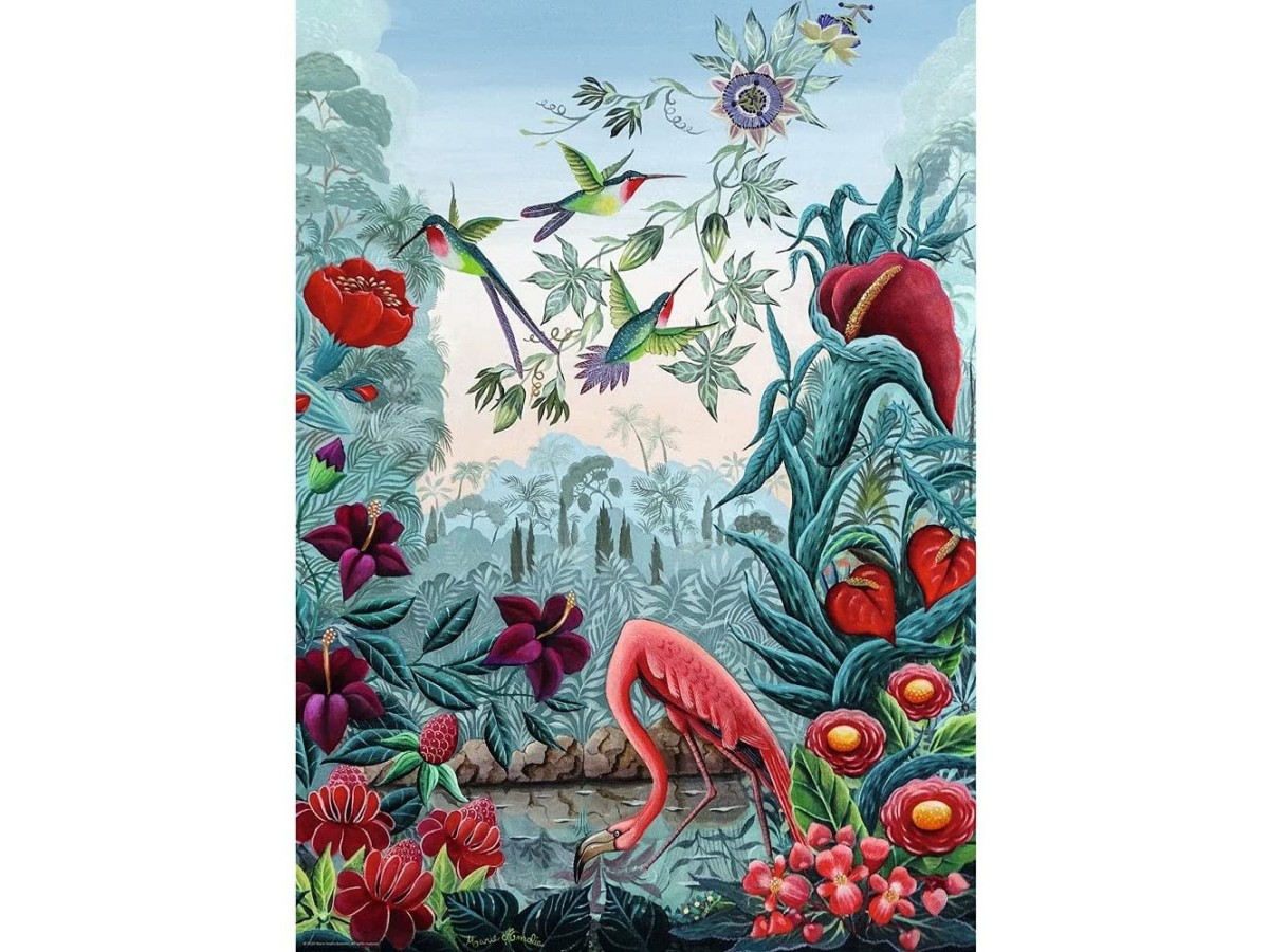 Imaginea puzzle-ului Heye 1000 piese - Bird Paradise ne surprinde cu un peisaj vibrant, plin de seninătate, ilustrat într-un stil vivid și naturalist. Un flamingo roz și mai mulți colibri zburători sunt reprezentați într-un decor luxuriant, împodobit cu vegetație bogată și flori colorate. Flora diversă, cuprinzând flori mari precum crini și trandafiri, în culori calde de roșu, violet și galben, completează tabloul. Fundalul pădurelui dens adaugă profunzime și mister scenei.