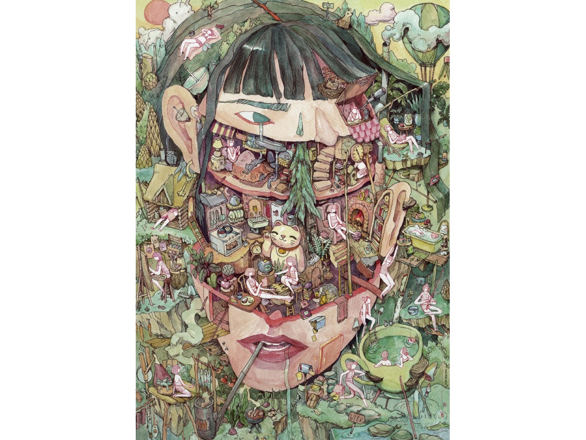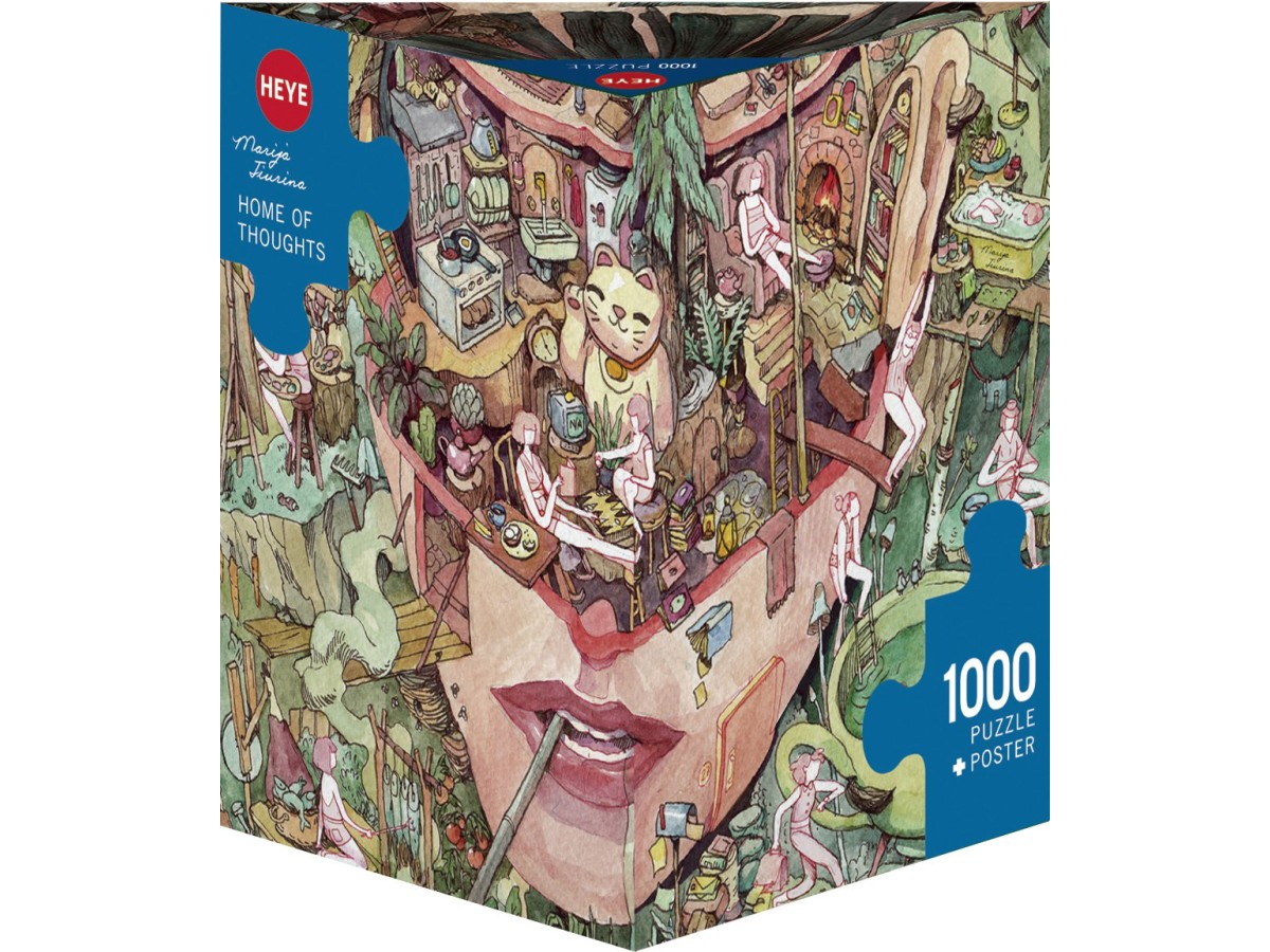 Ilustrația digitală intitulată 'Home of Thoughts' creată de Marija Tiurina este reprezentată în acest puzzle Heye cu 1000 de piese. Fiecare secțiune a feței, formată din diverse scene și elemente, este plină de activități diferite, cu personaje minuscule ce par să interacționeze între ele. Peisajul urban detaliat de pe frunte, scenele interioare din ochi și atmosfera vibrantă creată de culorile predominante de verde, bej, roz și crem, fac din această imagine un adevărat spectacol vizual.