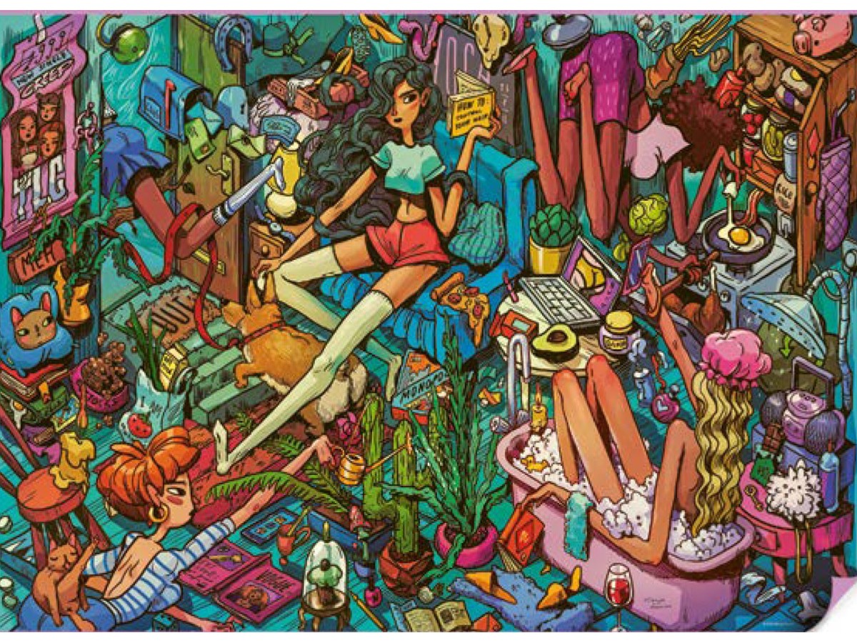 Ilustrația digitală concepută de Marija Tiurina, intitulată 'Homely Housemates', redă o scenă domestică vibrantă și plină de energie. În centrul compoziției, două tinere se odihnesc confortabil într-un interior eclectic, înconjurat de o varietate impresionantă de obiecte și plante. Una dintre ele citește pe un balansoar suspendat, iar cealaltă se află într-o baie cu spumă, bucurându-se de o băutură. Spațiul este plin de elemente colorate, de la cărți, lămpi, fotografii până la jocuri și bunătăți culinare, creând o atmosferă plină de viață și personalitate. Stilul vibrant și detaliat al artistei adaugă o notă de farmec și unicitate acestei scene, transformându-o într-o explozie de culoare și creativitate.