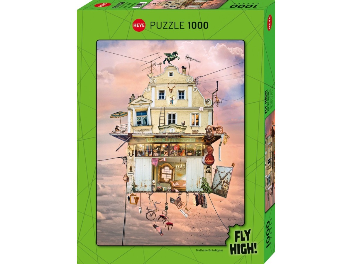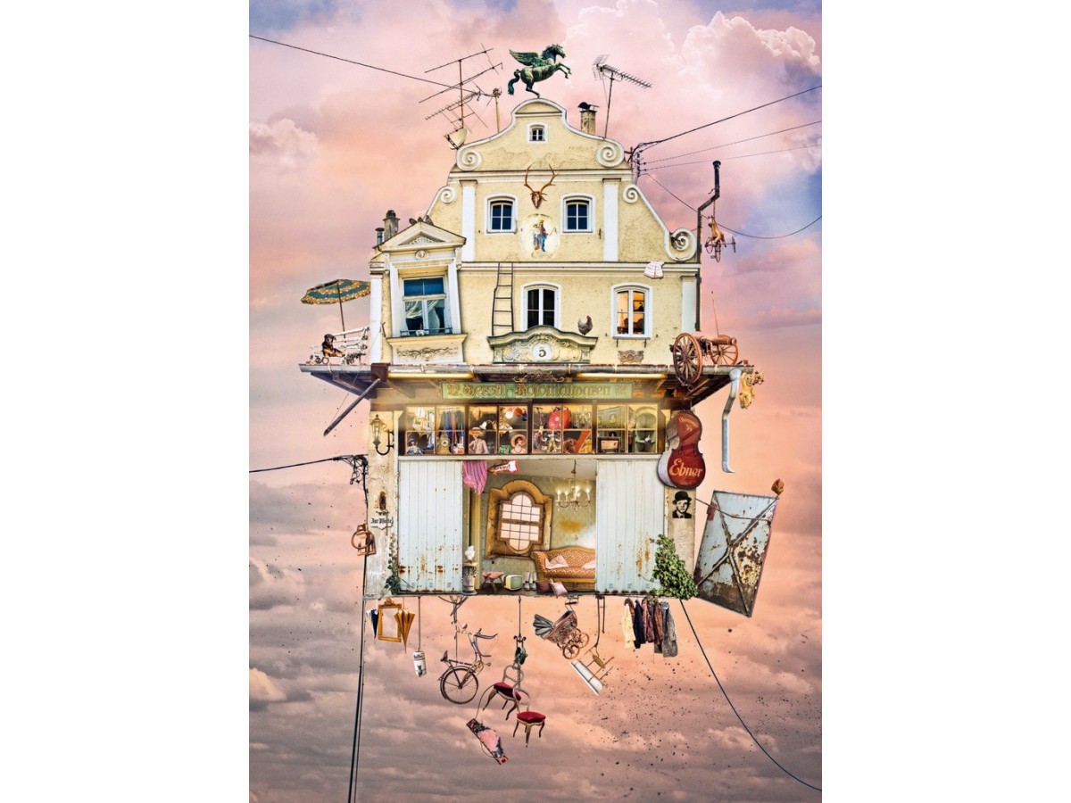 Imaginea puzzle-ului Heye 1000 piese Nathalie Bräutigam: Treasure House surprinde o ilustrație plină de elemente fantastice și detalii minuțioase, în care o casă suprarealistă este înconjurată de obiecte ce plutesc liber în aer. Fiecare etaj al casei este decorat într-o manieră unică, cu ferestre deschise ce dezvăluie obiecte neobișnuite, iar pe acoperiș se observă un spațiu plin cu cărți și un om zburător cu aripi mecanice.