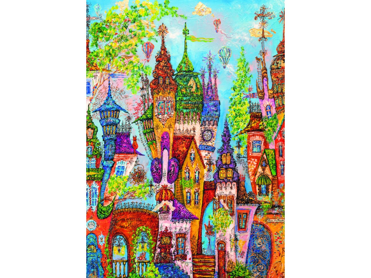 Această ilustrație vibrantă, realizată de Tatyana Murova, redă o serie de clădiri stilizate, care combină arhitectura fantastică cu elemente de basm. Fiecare clădire este unicată prin formă și culoare, având turle ascuțite, acoperișuri în culori vii și ferestre care par să aibă povești proprii. În fundal, cerul este decorat cu nori colorați și diverse forme flotante asemenea baloanelor sau lămpilor zburătoare, contribuind la atmosfera magică a scenei. Imaginea, care poate fi descrisă ca un colaj de culori și forme, aduce în prim-plan o simbioză între vis și realitate, creând un peisaj urban atipic, plin de energie și mister.