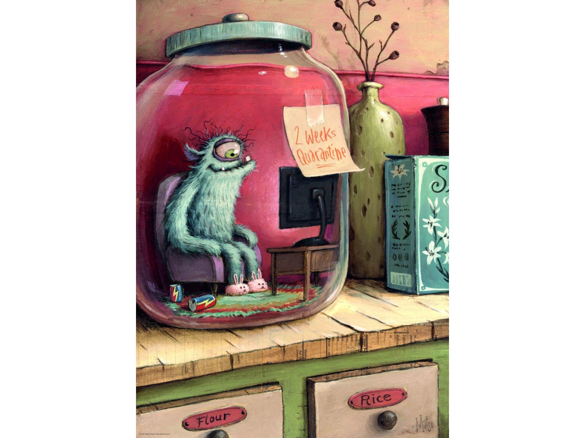 Această ilustrație aparține seriei Zozoville și poartă titlul Jarantine, fiind opera artistului cunoscut sub pseudonimul Mateo Dineen. Scena prezintă un personaj fictiv, amuzant, așezat într-un borcan imens de sticlă roz. Personajul, o creatură antropomorfă cu blană albă și ochi mari, urmărește un ecran de computer, având lângă el o ceașcă și purtând papuci în formă de iepurași. Pe perete, lângă borcan, sunt poziționate recipiente pentru făină și orez, precum și o vază cu o plantă înflorită. Pe borcan este lipit un semn pe care scrie '2 weeks Quarantine', sugerând o izolare voluntară. Fundalul ilustrației este un decor de bucătărie, cu sertare din lemn în tonuri calde.