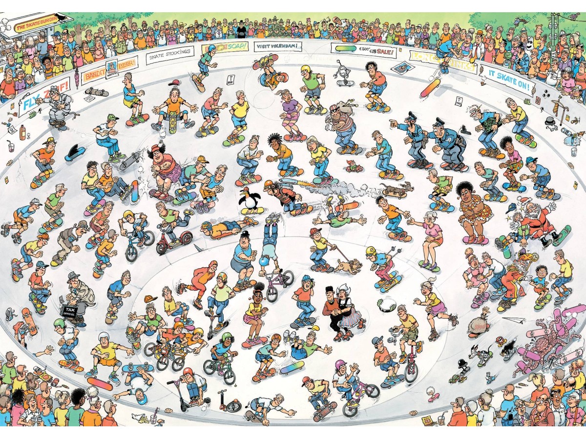 Imaginea acestui puzzle cu 1000 de piese Jumbo - Jan Van Haasteren: Riding the Skate Bowl (Jumbo-00625) este o ilustrație colorată și vibrantă care surprinde o scenă animată într-un patinoar pentru skateboard. Mulțimea diversă de personaje, de toate vârstele și stilurile, execută diverse trucuri și acrobații pe skateboards. Atmosfera din patinoar este plină de acțiune, fiecare colț al imaginii fiind ocupat de caractere în mișcare, oferind un sentiment de dinamism și energie. Publicul divers ilustrează o gamă largă de reacții, de la entuziasm la amuzament, urmărind cu atenție spectacolul oferit de skateri. Elementele de fundal, precum tribunele pline de spectatori și detalii minuțioase ale scenei, sunt realizate într-un stil detaliat și expresiv.
