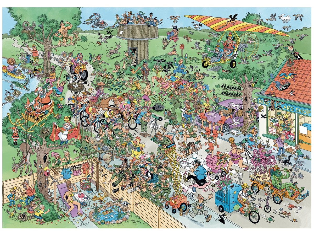 Această ilustrație colorată, creată de artistul Jan van Haasteren, este plină de viață și detalii amuzante, reclămind un tablou plin de umor și energie. Scena înfățișează o mulțime de persoane și animale în diverse activități de observare a păsărilor într-un spațiu exterior, similar unei grădini publice vaste. În partea stângă a ilustrației, un grup de persoane pare să fie într-un concurs de observat păsări, utilizând binocluri și notebook-uri pentru a înregistra observațiile. Central, tumultul este sporit de prezența unui papagal mare care scapă dintr-o cușcă, provocând o ușoară panică. Partea dreaptă arată o zonă de picnic unde diverse animale, inclusiv squirrelși păsări, interacționează comic cu oamenii prezenți.