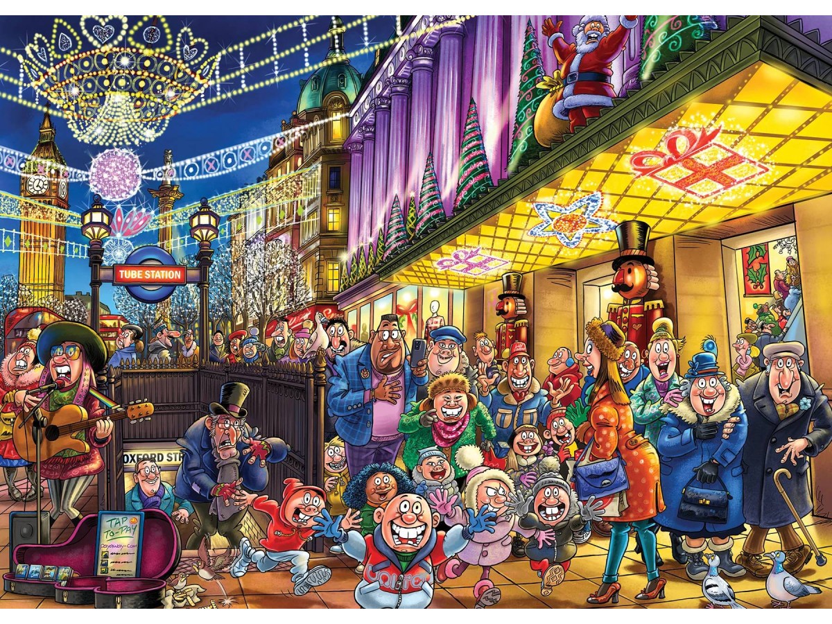 Imaginea puzzle-ului Jumbo 1000 piese - Wasgij Christmas 20 - Spirits of Christ surprinde o scenă vibrantă de sărbătoare într-un oraș aglomerat, probabil în timpul sezonului de Crăciun. Decorul festiv include luminițe strălucitoare și panglici colorate, iar strada este plină de oameni de toate vârstele, îmbrăcați în haine de iarnă. Personajele radiază bucurie și entuziasm, purtând cadouri și baloane. Magazinele decorate festiv și iluminatul stradal completează atmosfera sărbătorească, într-o ilustrație detaliată și colorată, realizată într-un stil caricatural.