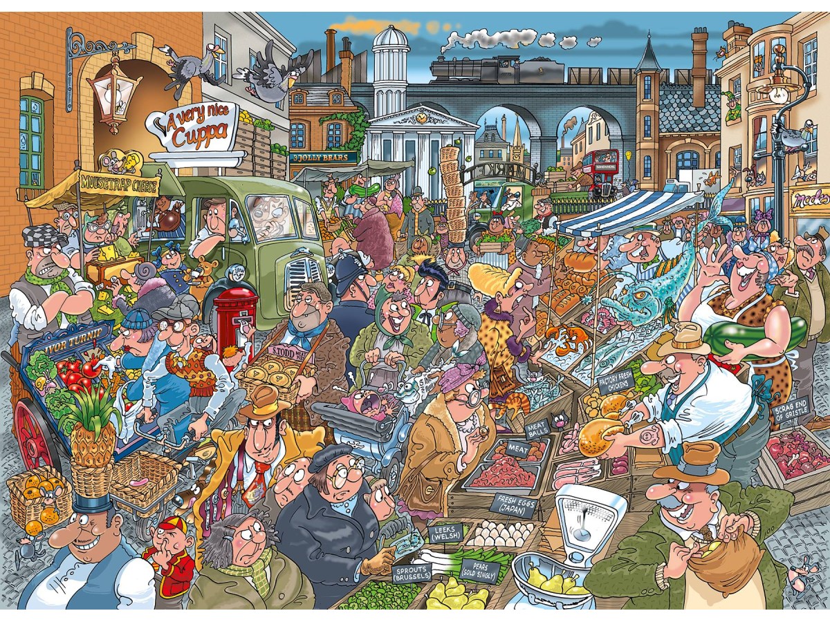 Imaginea puzzle-ului Jumbo Wasgij Destiny 26 - Organic Overload! surprinde o piață aglomerată, plină de oameni și tarabe, într-un decor urban ce amintește de orașele europene tradiționale. Peisajul este animat de personaje variate, de la vânzători și cumpărători până la vizitatori de diferite vârste. În prim-plan, sunt vizibile mai multe tarabe, unele cu fructe și legume proaspete, altele cu produse de panificație. Prin mulțime se remarcă personaje îmbrăcate în haine colorate, creând o scenă vibrantă și plină de viață. Arhitectura clădirilor din fundal sugerează o influență europeană, cu fațade ornamentate și detalii clasice. Această ilustrație complexă și bine detaliată oferă o privire captivantă asupra vieții urbane agitate.