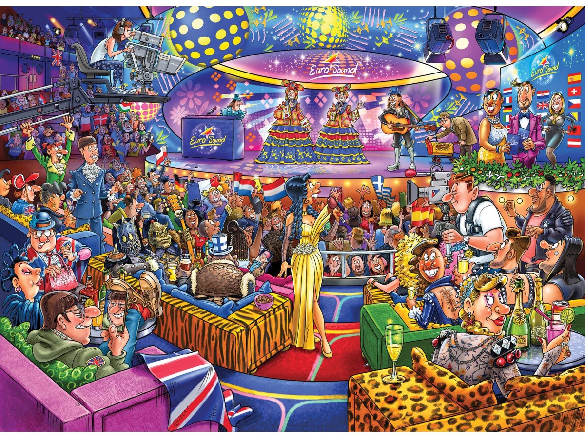 Această ilustrație colorată prezintă o scenă animată și plină de viață într-o sală mare, unde are loc un concurs de muzică european. Imaginea este bogată în detalii și culori vibrante, ilustrând o diversitate de personaje în diferite costume și expresii, subliniind o atmosferă festivă. Fiecare grup de personaje pare să reprezinte diferite țări, evidențiate prin steagurile pe care le poartă sau elemente distinctive de vestimentație. Centrul scenei este dominat de o scenă pe care un grup performează, iluminată puternic, în timp ce o mulțime de spectatori și juriul privesc cu entuziasm. Stilul artistic este caricatural și plin de umor, cu o abundență de elemente satirice ce par să critice și să celebreze cultura pop și evenimentele muzicale internaționale.