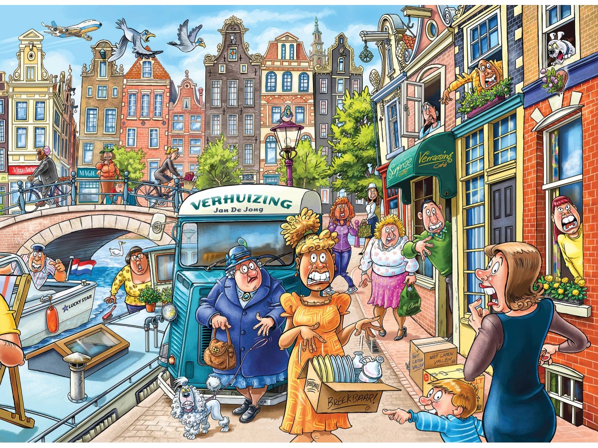 Imaginea redă o scenă animată și colorată dintr-o stradă aglomerată, probabil într-un oraș european dată fiind arhitectura clădirilor. În centrul compoziției, o familie pare să se mute, încărcând sau descărcând diverse obiecte dintr-o camionetă de mutări. Personaje diverse, de la tineri la bătrâni, sunt înfățișate în diverse poziții și cu expresii vii, fiecare contribuind la povestea scenei. Strada este străbătută de un canal, peste care se întinde un pod, adăugând o dimensiune pitorească compoziției generale.