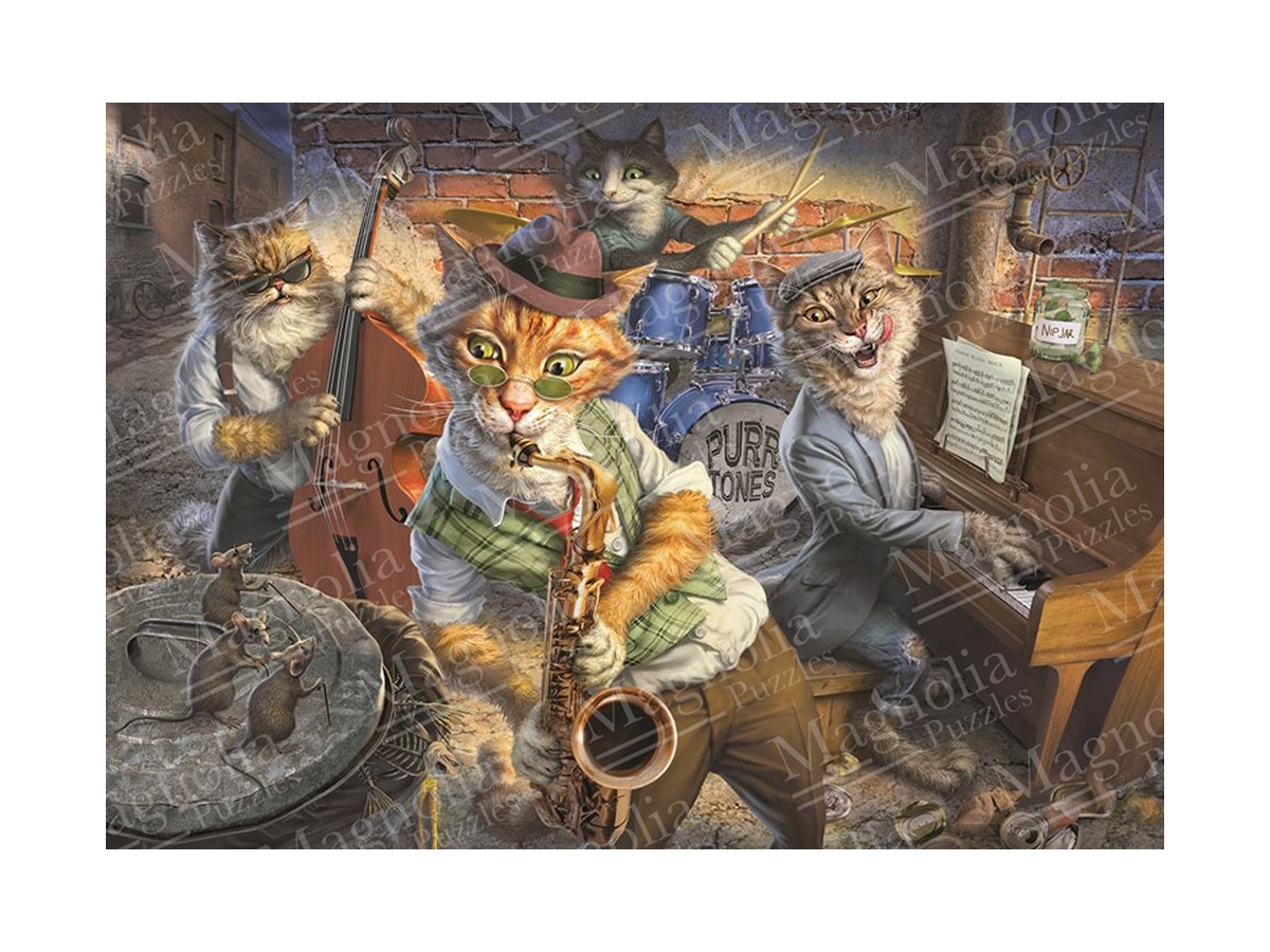 Imaginea prezintă o ilustrație vibrantă și detaliată cu patru pisici antropomorfice interpretând o scenă de bandă de jazz. Pisica din planul frontal, îmbrăcată într-o ținută stilată de epocă cu jachetă și eșarfă, ține în labă un saxofon, sugerând că este solistul trupei. Alături, pe un scaun, o altă pisică poartă un trilby (pălărie) și joacă la contrabas, privind cu atenție partitura din față. În fundal, o a treia pisică, cu ochelari și pălărie, stă la un pian antic, iar o a patra, abia vizibilă în spatele celorlalte, este bateristul grupului. Scena este plasată într-un interior rustic, cu cărămizi la vedere și detalii de epocă, cum ar fi un ceas de perete și diverse afișe pe peretele din fundal.