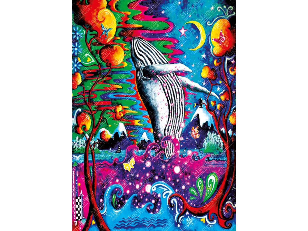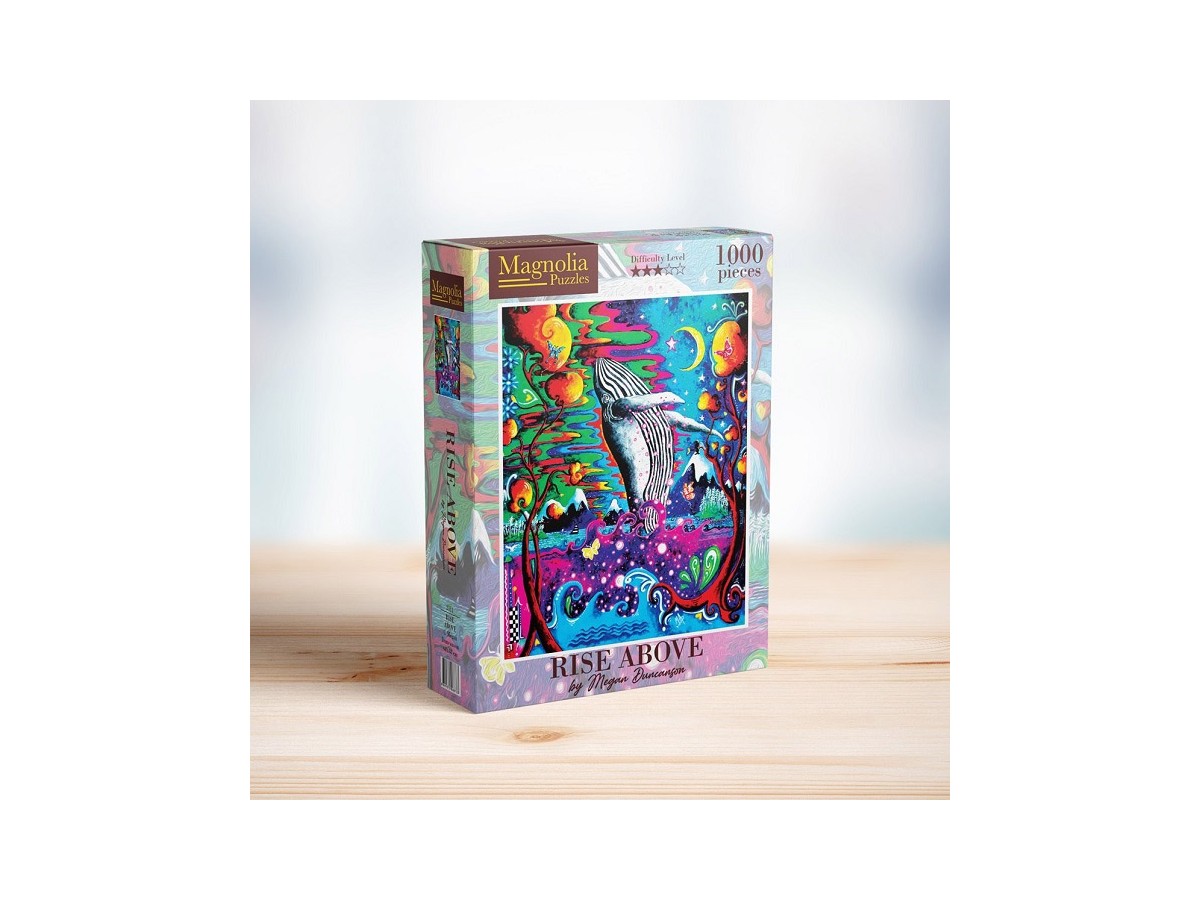 Imaginea acestui puzzle cu 1000 de piese Magnolia, intitulat 'Rise Above', este o pictură vibrantă și colorată realizată de Megan Duncanson. Pictura combină elemente naturaliste cu un stil abstract, folosind culori puternice și contrastante pentru a crea un peisaj visător. În centrul compoziției este o balenă albastră cu dungi albe, care pare să plutească deasupra apei. Dedesubt se desfășoară un peisaj marin cu apă plină de dungi ondulate și elemente florale stilizate, îmbogățit cu copaci luxurianți, munți și un cer nocturn strălucitor presărat cu stele, planete și o lună crescentă.