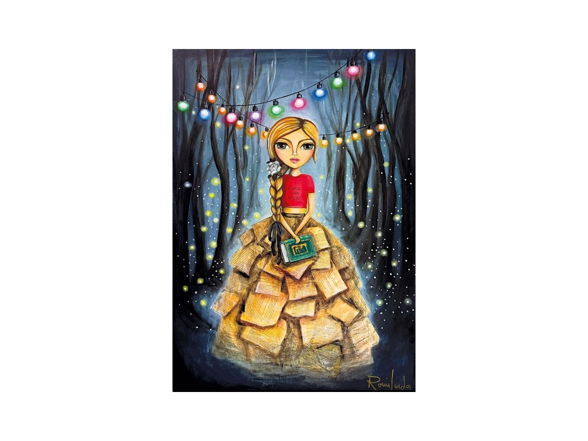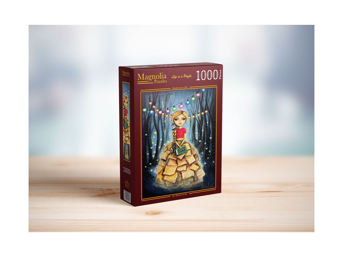 Imaginea puzzle-ului Magnolia cu 1000 piese, intitulat Bookworm Girl, ilustrează o fată tânără într-o bibliotecă plină de cărți. Aceasta este îmbrăcată într-o rochie elegantă, având părul blond strâns într-o coadă înaltă și purtând o bandă cu forme sferice pe cap, sugerând un aspect de prințesă modernă. În jurul ei, rafturile sunt pline de cărți cu coperte colorate, creând o atmosferă visătoare și liniștită. Ilustrația digitală combină elemente realiste și fantastice, captivând privitorul cu detalii subtile și culori vibrante.