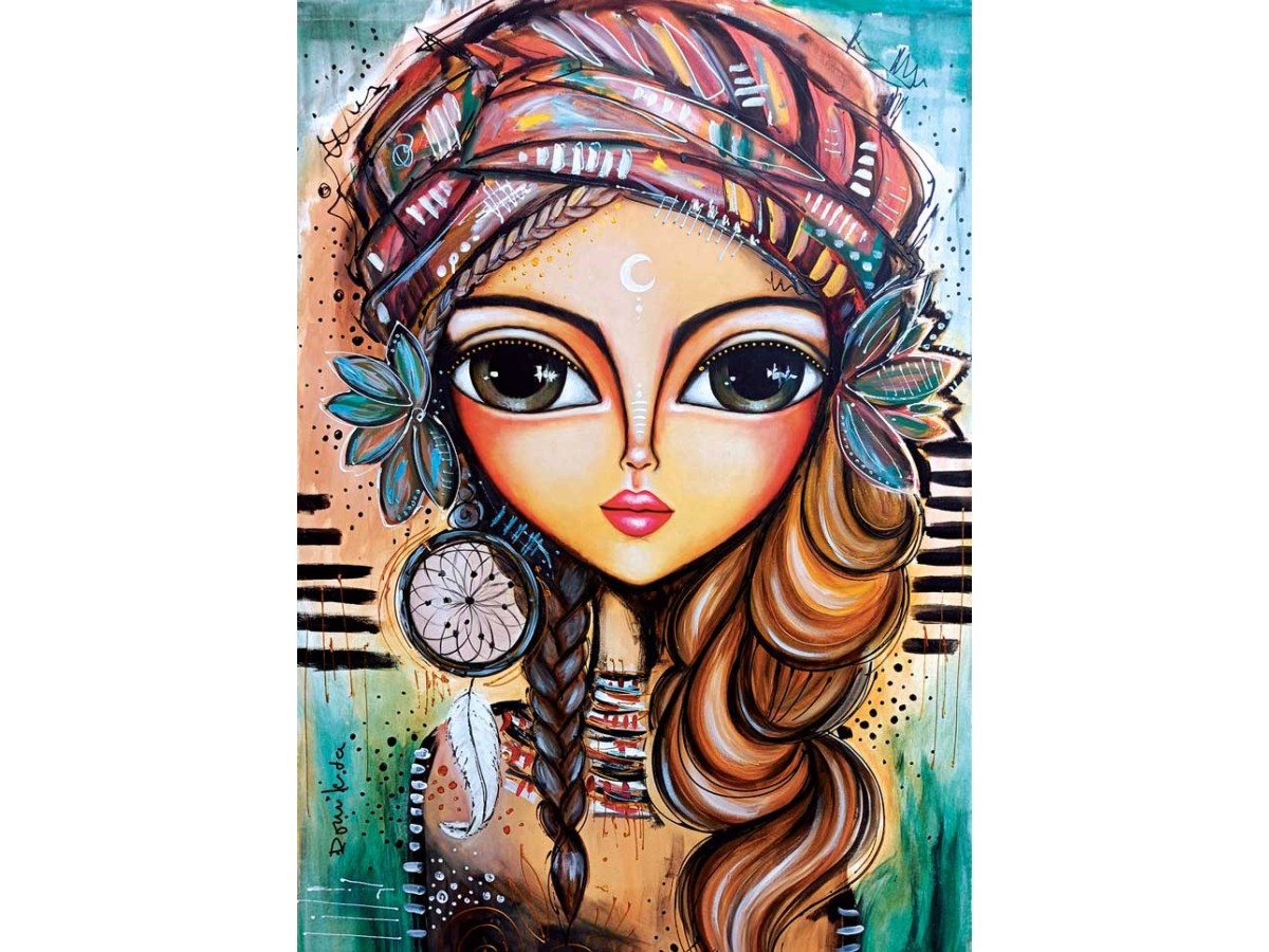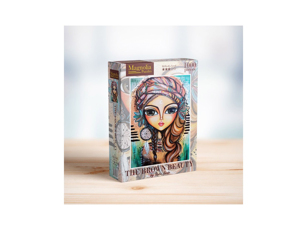 Imaginea de pe puzzle-ul Magnolia cu 1000 de piese, intitulată 'The Brown Beauty' și realizată de Romi Lerda, surprinde un portret stilizat al unei femei cu trăsături mari și expresive. Culorile calde și detalii intricate aduc o notă de eleganță și mister, iar fundalul vibrant completează atmosfera exotică a lucrării.
