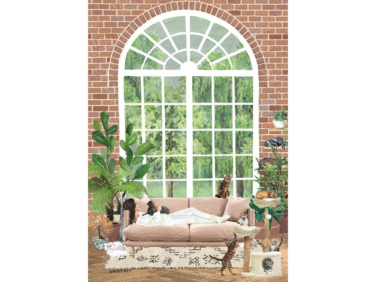 Ilustrația prezintă o scenă liniștită într-un interior decorat rustic, dominat de prezența unei ferestre mari, arcuite, care oferă o priveliște generoasă către o grădină luxuriantă. Zidurile de cărămidă roșie și ferestrele cu rame albe conferă un aer cald și primitor. În centrul compoziției, un canapea mare cu motive florale este locul de odihnă pentru mai multe pisici, care par să se bucure de liniștea și confortul oferite. Pe lângă canapea, diferite plante de interior, de la ferigi până la cactuși, adaugă o notă de verdetea scenei, în timp ce diverse obiecte de decor, cum ar fi o vază cu flori și cărți, completează atmosfera acasă.