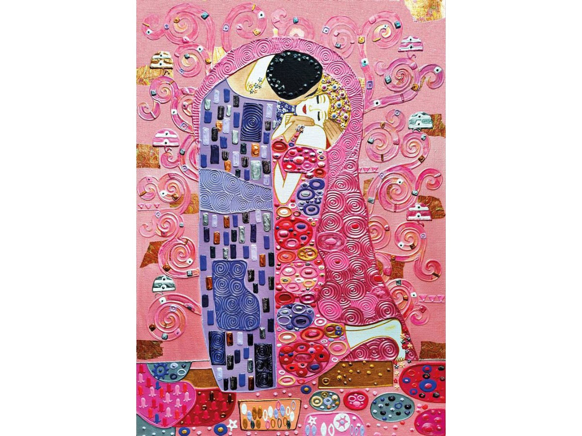 Opera de artă reprezentată este 'The Kiss' de Gustav Klimt, o pictură în stil art nouveau. Aceasta ilustrează un cuplu îmbrățișat, îmbujorat într-o aură de dragoste. Personajele sunt invaluite într-un căoraf decorat cu modele geometrice complexe şi simbolice, predominante albastru şi argintiu. Fundalul este compus din formele abstracte aurii şi roz, creând un contrast vibrant şi captivant cu pelicula centrală a doi iubiți. Textura este bogată, cu aplicarea luxuriantă a foilor de aur, specifică stilului lui Klimt.