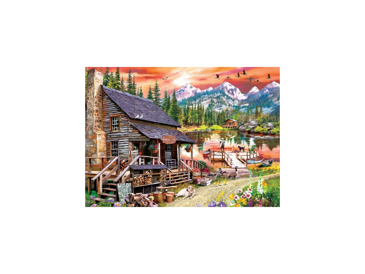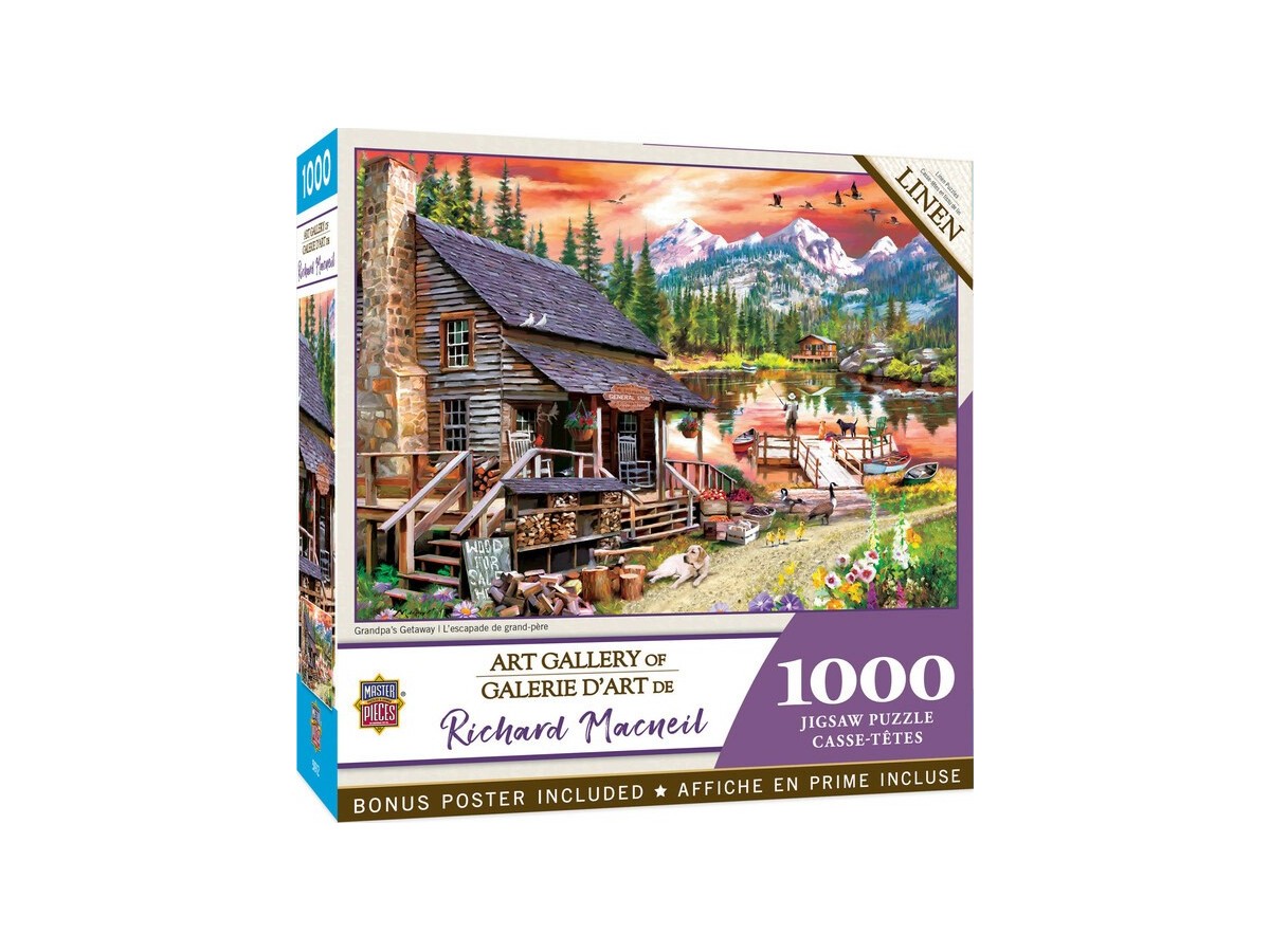 Imaginea puzzle-ului Master Pieces cu 1000 piese, intitulat 'Grandpa's Getaway', te va purta intr-o scenă pitorească rustică. O cabană de lemn se înalță pe malul unui lac de munte, înconjurată de flori viu colorate și un gard mic de lemn, creând o atmosferă primitoare și caldă. În fundal, munții înalți acoperiți de zăpadă se reflectă în apele liniștite ale lacului, sub un cer populat de păsări zburătoare.