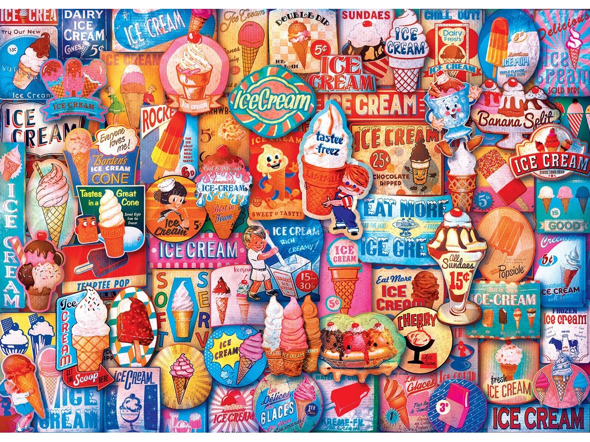 Imaginea prezentată este o ilustrație colorată care surprinde în detaliu diversitatea tratamentelor cu înghețată. De la înghețate pe băț și cornete, până la sundaes și milkshake-uri, aceasta aduce un omagiu culturii înghețatei. Se remarcă multiple reclame vintage și logo-uri nostalgice, care ar putea aparține unor branduri fictive sau stilizate. Nuanțele predominante sunt roșu, albastru și alb, creând un contrast vizual plăcut, în timp ce stilul vibrant și jucăuș al ilustrației adaugă un aer festiv întregii compoziții. Este vorba despre un puzzle cu 1000 de piese, potrivit pentru adulți, ce poartă marca Master Pieces.