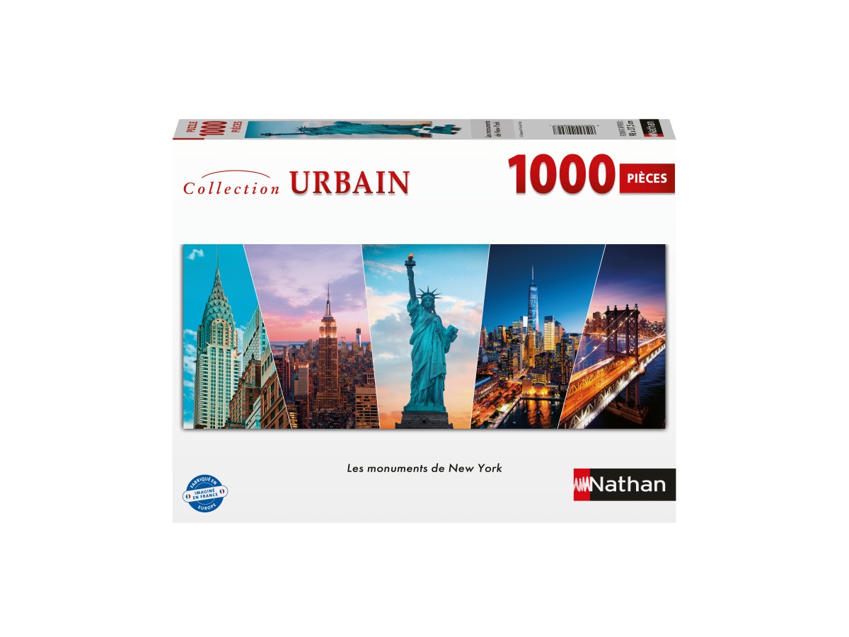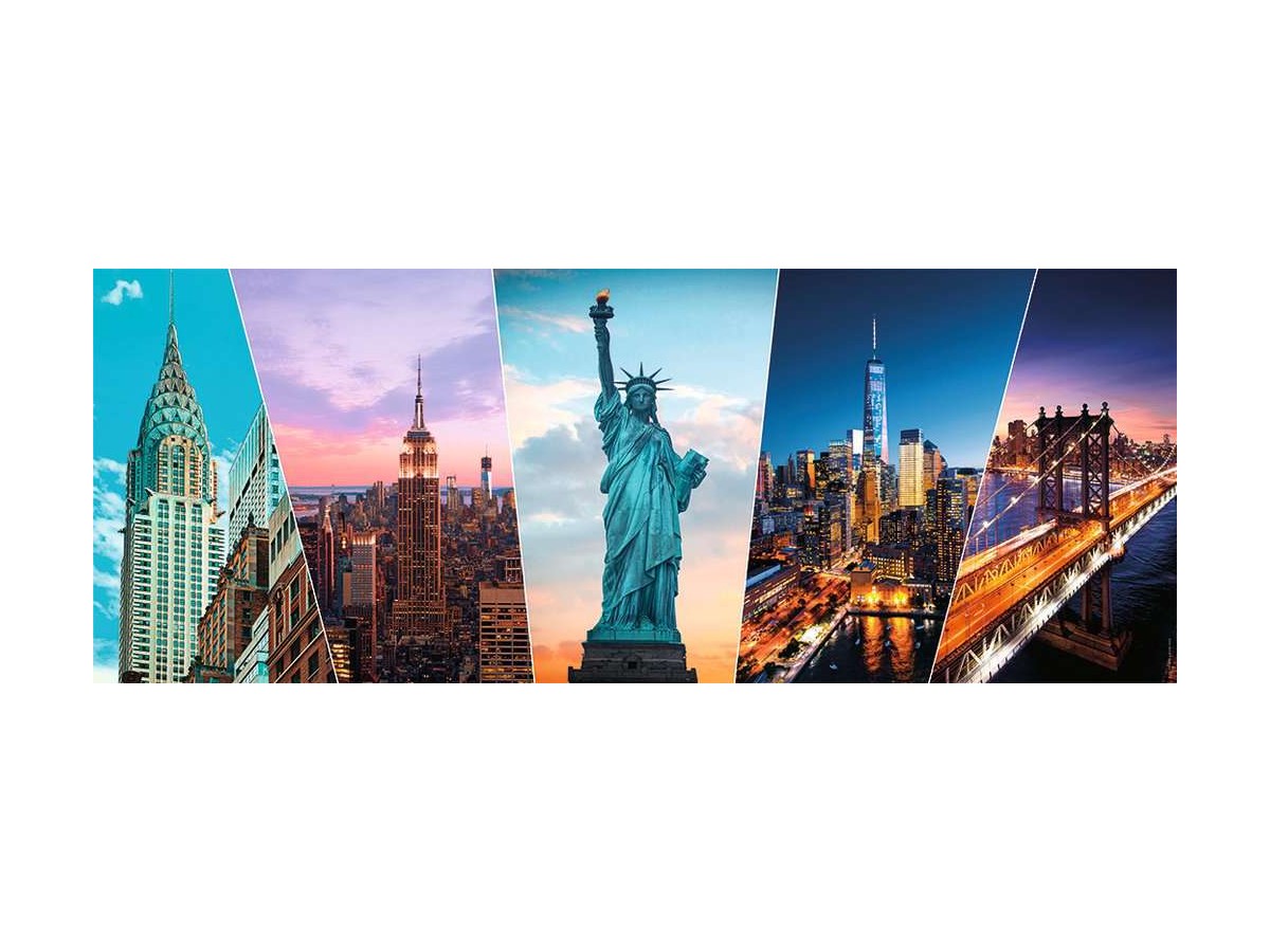 Imaginea puzzle-ului Nathan cu 1000 piese - New York Landmarks surprinde trei reprezentări iconice ale orașului New York. Pe partea stângă se remarcă faimosul Chrysler Building, cu forma sa distinctivă și ornamentele Art Deco. În centrul ilustrației se înalță Statuia Libertății, simbol al libertății și democrației americane, cu torța sa înaltă. Pe partea dreaptă, siluetele zgârie-norilor din Manhattan se conturează împotriva unui cer dramatic la apus, creând un peisaj urban vibrant și divers.