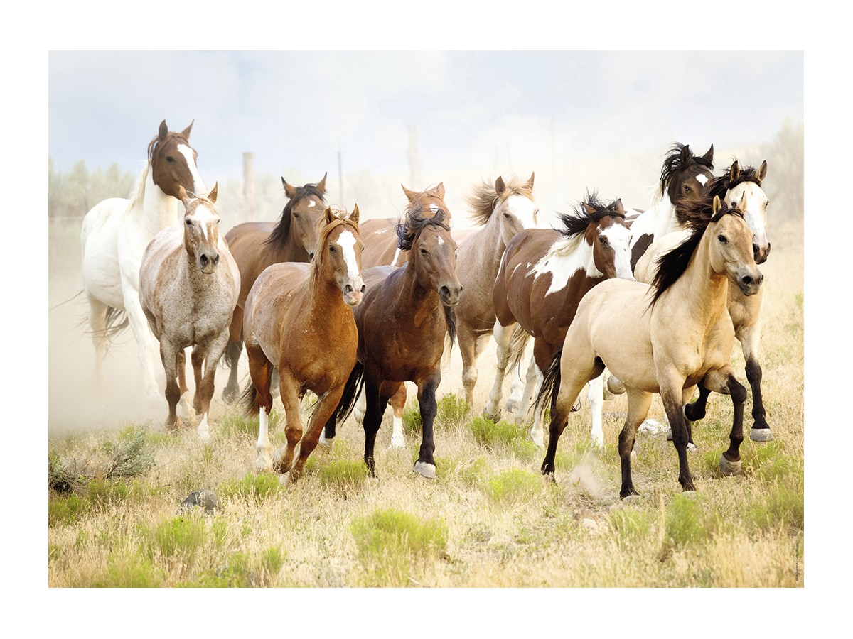 Imaginea puzzle-ului Nathan-00919 Riding in the Desert surprinde un grup de cai galopând energic printr-un mediu arid, posibil un deșert. Caii de diferite culori, de la alb la maro închis, par să fie în mișcare liberă și neîngrădită, trecând prin cadrul vizual cu o viteză impresionantă. Spectacolul de forță și libertate este accentuat de praful ridicat sub copitele lor, sugerând o viață sălbatică și neîngrădită.