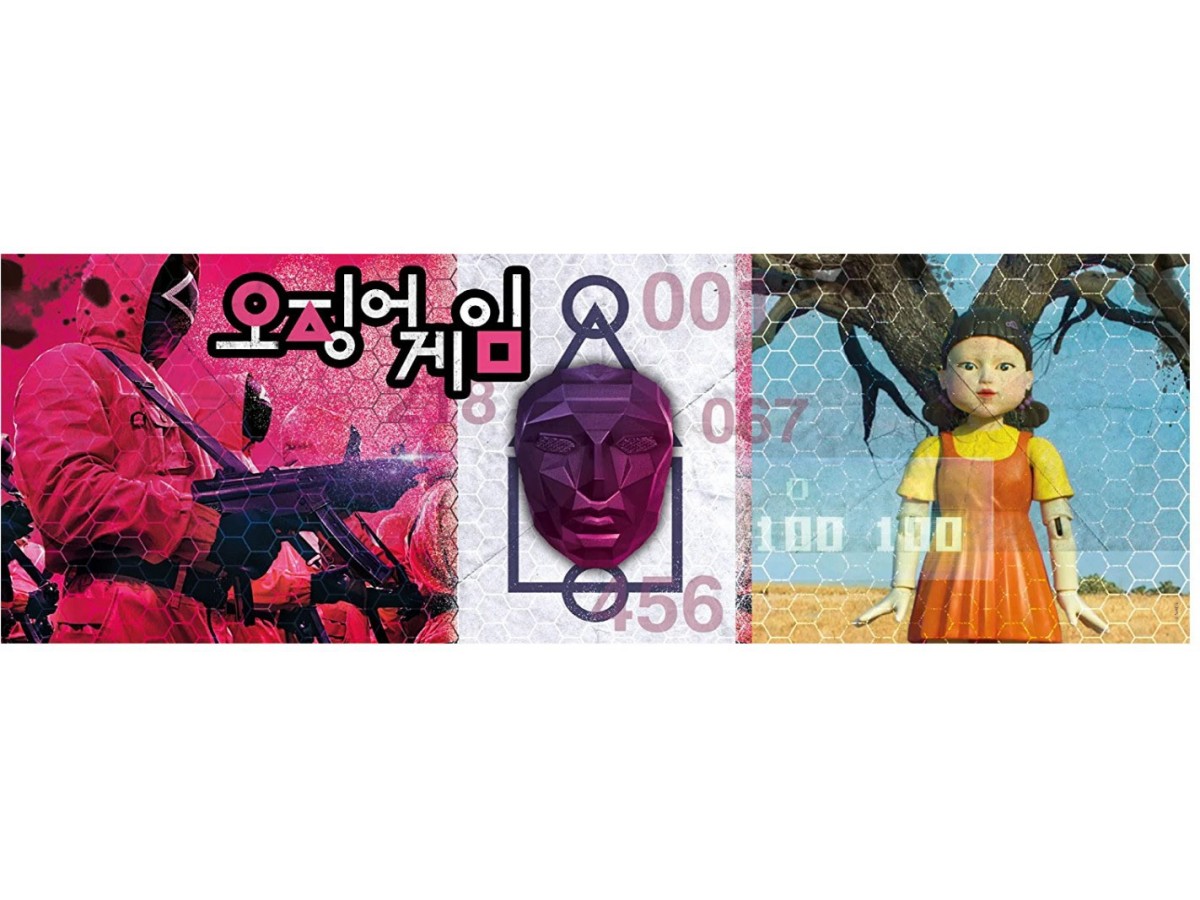 Imaginea ilustrează un montaj de scene din serialul de televiziune Squid Game, creat de Hwang Dong-hyuk și difuzat de Netflix. În stânga, apare o imagine intens colorată în nuanțe de roz, cu mai mulți participanți îmbrăcați în uniforme roz, purtând măști negre, implicați într-o scenă tensionată din joc. Unul dintre aceștia este echipat și poartă o armă. Segmentul central al compoziției prezintă o reprezentare stilizată a unei măști purpurii, cu un design minimalist și modern, simbol al frizei anonime și a controlului autoritar din joc. Dreapta compoziției este dominată de o figurină feminină gigantă, ilustrată într-o postură statică, îmbrăcată într-o rochie portocalie, având un fundal cu motiv de cioburi de sticlă.