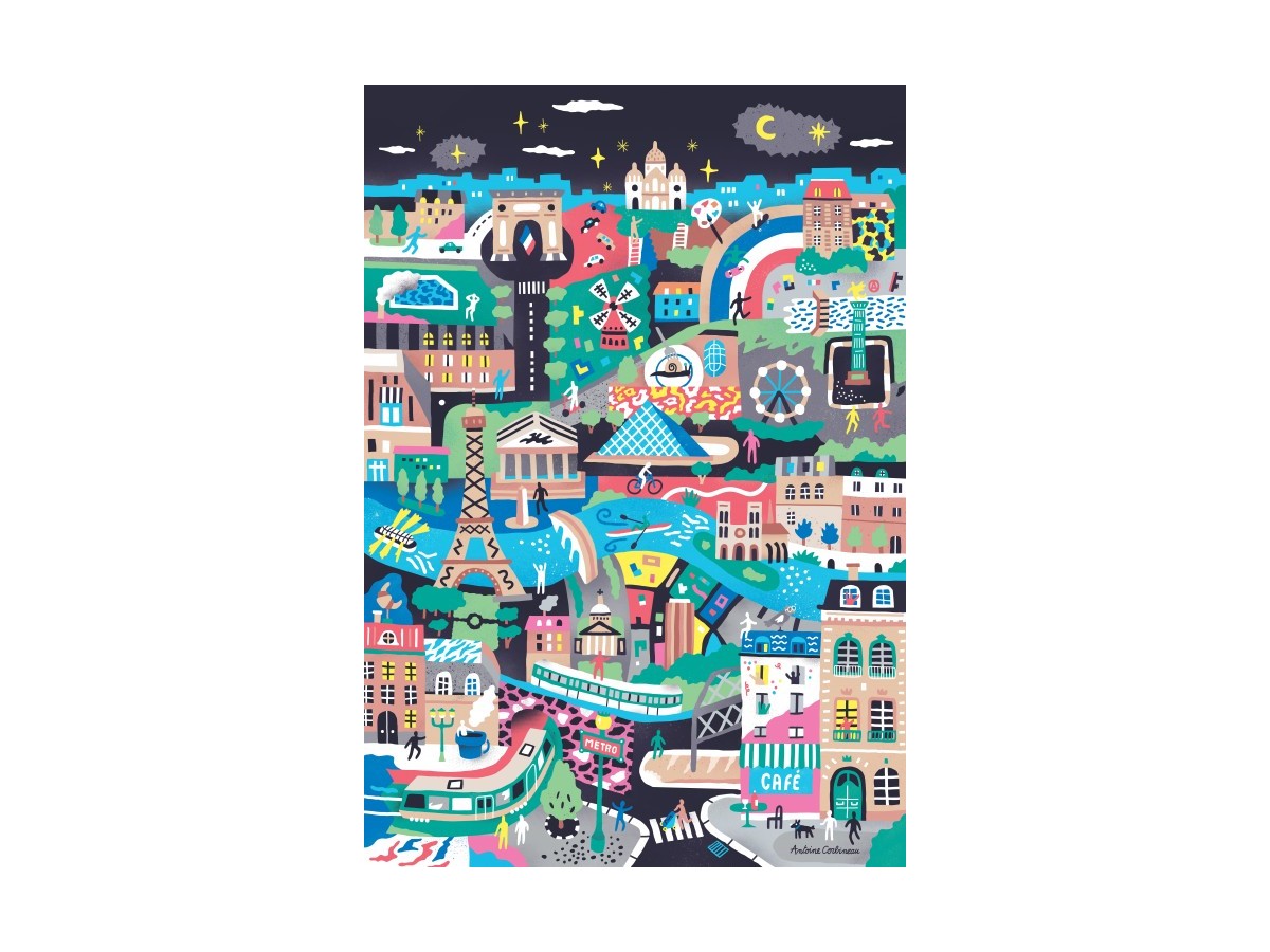 Această ilustrație digitală vibrantă, creată de Antoine Corbineau, captează esența Parisului printr-o reprezentare plină de culoare și stilizată a monumentelor sale iconice. Diversitatea arhitecturală a orașului este prezentată într-un mod ludic și abstract, evidențiind elemente notabile precum Turnul Eiffel, Arcul de Triumf și Catedrala Notre-Dame. În imagine se pot observa, de asemenea, diverse scene de viață cotidiană, cum ar fi terase de cafea, oameni plimbându-se și bicicliști, toate integrate într-un peisaj urban animat și colorat. Paleta de culori utilizată este largă, incluzând nuanțe de albastru, roșu și verde, care adaugă o notă de dinamism și veselie compoziției.