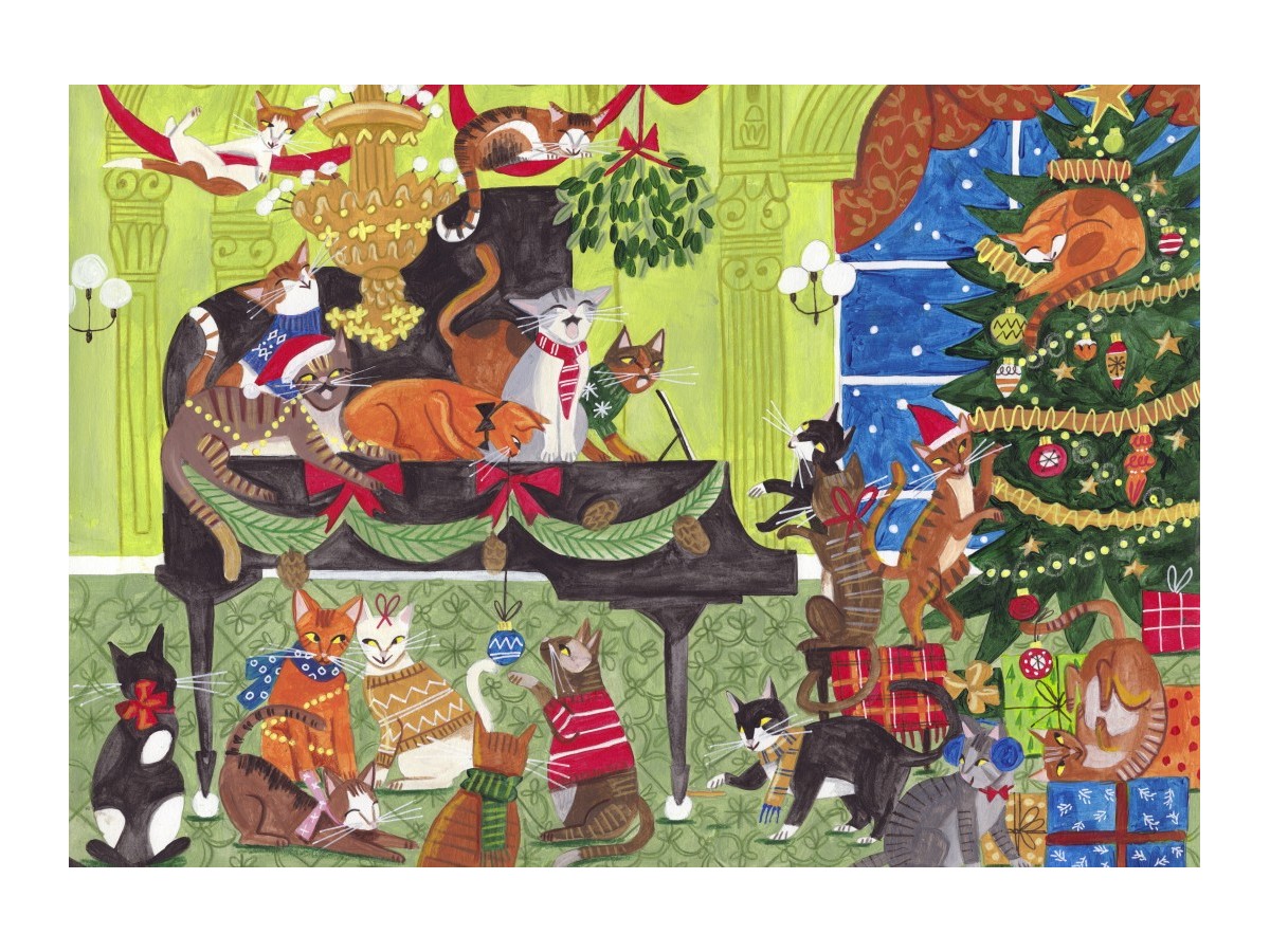 Imaginea captivanta a puzzle-ului ilustreaza o scena plina de culoare si viata, surprinzand mai multe pisici de diferite rase si culori care interactioneaza cu elemente muzicale intr-un decor de sarbatoare. Pisicile sunt redate in diverse pozitii, unele stau pe scaun, altele pe pian, iar o pisica in centrul compozitiei se joaca cu globuri de Craciun. Fundalul este impodobit cu decoratiuni festive, un brad de Craciun incarcat cu lumina si ornamente, si diverse pachete de cadouri, sugerand o atmosfera de sarbatoare. Stilul detaliat si colorat al ilustratiei, cu tonuri vii si un sentiment de bucurie, capteaza cu siguranta atentia oricarui iubitor de pisici si de puzzle-uri.