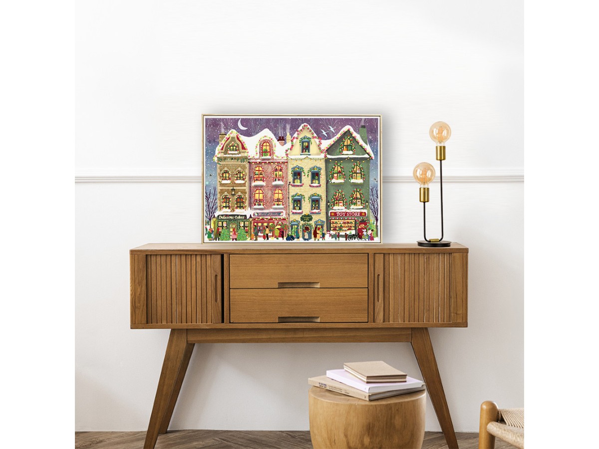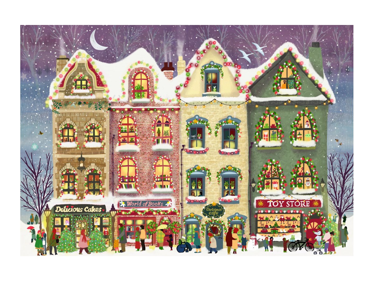 Imaginea puzzle-ului prezintă o stradă animată de sărbătoare, cu trei clădiri decorate festiv. Prima clădire din stânga are un semn ce indică 'Delicious Cakes' şi arată ca o patiserie, cu o vitrină plină de prăjituri şi dulciuri care atrag trecătorii. Cea de-a doua clădire este o bibliotecă, 'World of Books', plină de cărţi şi luminată cald. Ultima clădire este un magazin de jucării, 'Toy Store', care prezintă o selecţie colorată de jucării în vitrină. Strada este plină de oameni care se bucură de atmosfera de sărbătoare, inclusiv familii cu copii, cupluri şi grupuri de prieteni. Căderile uşoare de zăpadă adaugă un sentiment de iarnă scenei, îmbrăcând totul într-un decor festiv.