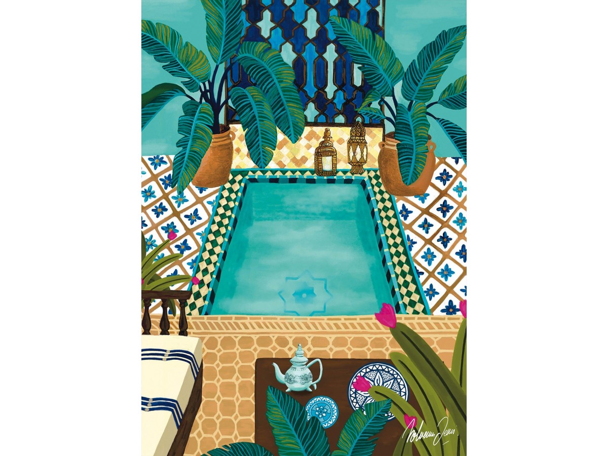 Ilustrația digitală, semnată de Nolwenn, prezintă tema unui riad marocan, sugerând o atmosferă relaxantă și exotică. În centrul compoziției se află o piscină cu apă turcoaz, înconjurată de pereți decorativi cu mozaic în nuanțe de albastru și alb și o podea de teracotă. Zona este înfrumusețată de plante tropicale cu frunze mari și de câteva obiecte decorative tradiționale, cum ar fi lămpi ornamentale și o ceainică. Întreaga scenă este îmbogățită de elemente arhitecturale specifice, cum ar fi arcade și jaluzele de lemn, punând în valoare estetica culturală specifică locurilor nord-africane.