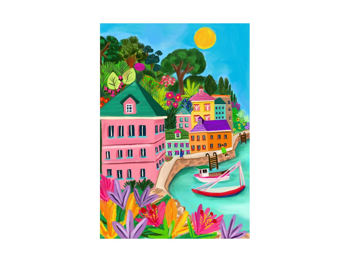 Imaginea puzzle-ului cu 1000 de piese Pieces & Peace - Polperro Palette prezintă un peisaj marin idilic, cu o arhitectură specifică și o vegetație luxuriantă, în nuanțe pastelate de roz, galben și verde. Clădirile cu mai multe etaje sunt amplasate pe malul apei, alături de o barcă cu pânze, sub un cer senin și un soare strălucitor.