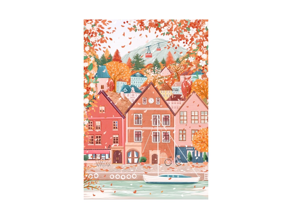 Imaginea ilustrează un peisaj urban pitoresc, posibil inspirat de orașul Bergen, cunoscut pentru arhitectura sa colorată și atmosfera vibrantă. În prim-plan, vedem o serie de clădiri istorice, cu fațade în nuanțe calde de roșu și portocaliu, care reflectă stilul arhitectural tradițional european. Aceste clădiri sunt dispuse de-a lungul unui canal, sugerând o legătură cu abundența apelor ce caracterizează peisajele urbane scandinave. Toamna pare să fie în plină desfășurare, cu copaci în nuanțe de aur și portocaliu care ramează întreaga scenă, sub un cer parțial acoperit de nori subtil tonificați. În fundal, un mic munte sau deal adaugă profunzime imaginii, în timp ce diferite elemente decorative, cum ar fi lămpi stradale și bărci ancorate, completează această viziune idilică a unui oraș plin de viață și culoare.
