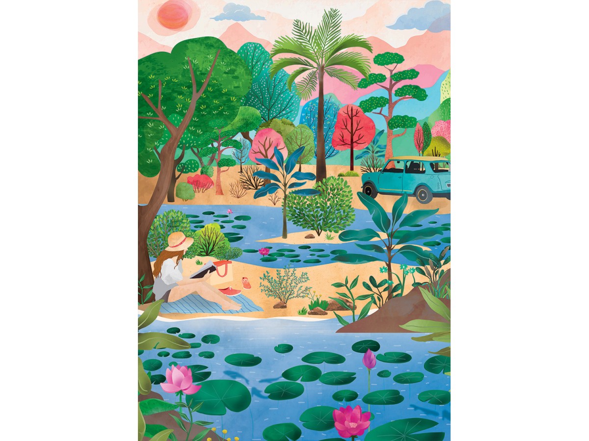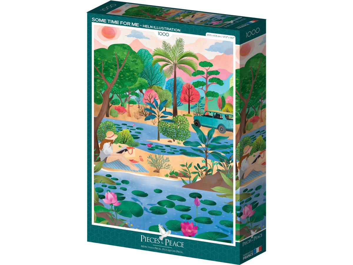 Acest puzzle cu 1000 de piese Pieces & Peace - Some Time for Me te va purta intr-o lume pitorească din natură, unde calmul și relaxarea sunt la ele acasă. Ilustrația digitală surprinde o scenă idilică, cu un mic lac cu nenufari în prim plan, iar o femeie contemplativă în rochie de vară se bucură de peisajul înconjurător. Fundalul bogat în vegetație diversificată completează tabloul natural, cu arbori tropicali și arbuști colorați. O mașină de safari discretă sugerează posibilitatea de a explora această zonă naturală, integrând armonios omul și natura într-o poveste vizuală captivantă.