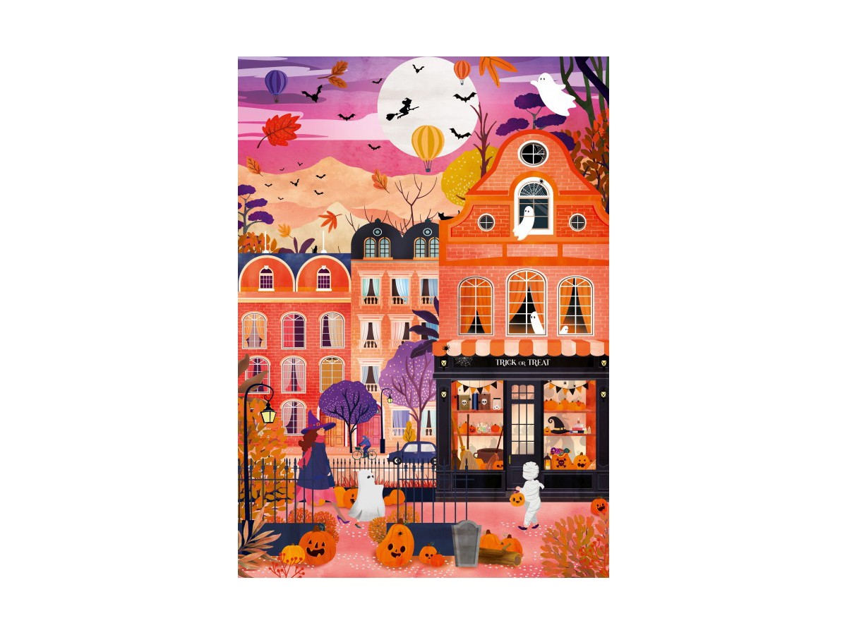 Imaginea acestui puzzle cu 1000 piese Pieces & Peace - Trick or Treat surprinde o scenă vibrantă dintr-un oraș în timpul sărbătorii de Halloween. Strada aglomerată este plină de oameni costumați și decorațiuni tematice, iar casele din fundal sunt decorate cu lumini și dovleci sculptați. Atmosfera misterioasă a sărbătorii este accentuată de cerul în tonuri de mov și portocaliu, cu lilieci și o lună mare, galbenă.