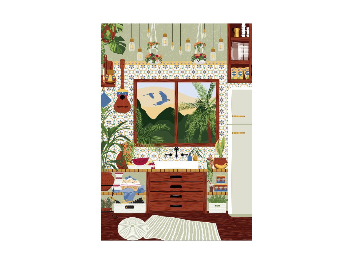 Imaginea ilustrează o scenă interioară vibrant colorată, având ca element central o bucătărie tradițională venezueleană. Peste tot se observă detalii autentice și decorative: rafturi pline cu borcane de condimente, vase ceramice și plante ornamentale. Un element neașteptat este fereastra care oferă o priveliște spre un peisaj tropical, jucând rolul unui tablou în cadrul acestui spațiu. Patru scaune și o masă simplă, așezate central, completează încăperea. Peretele este decorat cu motive etnice și diferite supendii ca un ceas vintage și o chitară, conferind locului o atmosferă caldă și primitorie.