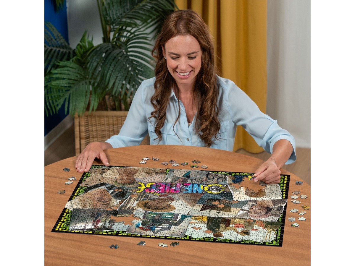 Ilustrația puzzle-ului Ravensburger cu 1000 de piese „In search of One Piece” prezintă o colecție de scene cu personaje diverse dintr-o poveste de aventuri marinăresc. În centrul compoziției, este plasat un bărbat tânăr, îmbrăcat în haine casual, cu o pălărie de paie, semn distinctiv al caracterului său. Este înconjurat de alte personaje, inclusiv un bărbat mai în vârstă cu părul lung și alb și o femeie tânără cu părul negru, ce poartă un top cu volane. Fiecare segment al ilustrației sugerează diferite momente ale unei călătorii pe mare, de la scene pline de acțiune la momente de camaraderie între personaje. Fundalul este dominat de imagini ale navelor și mărilor, întărind tema aventurii maritime.