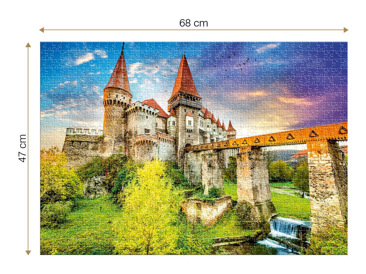 Dimensiunile puzzle-ului sunt de 47 x 68 cm, oferind o panoramă generoasă asupra ilustrației Castelului Corvin, permitând rezolvarea în detaliu a fiecărui element al scenei. Fiecare piesă se potrivește perfect în ansamblul final, creând o imagine armonioasă și completă a acestui monument istoric impresionant.
