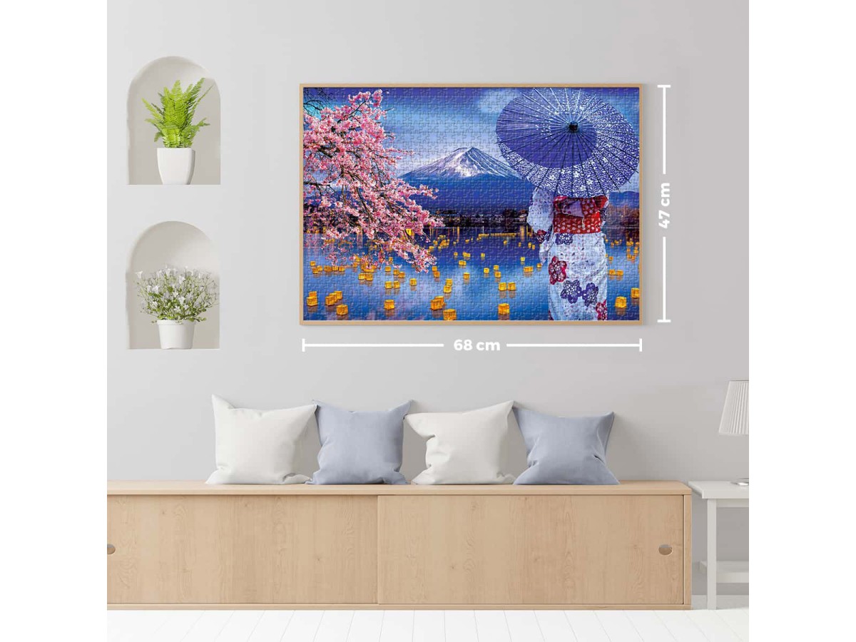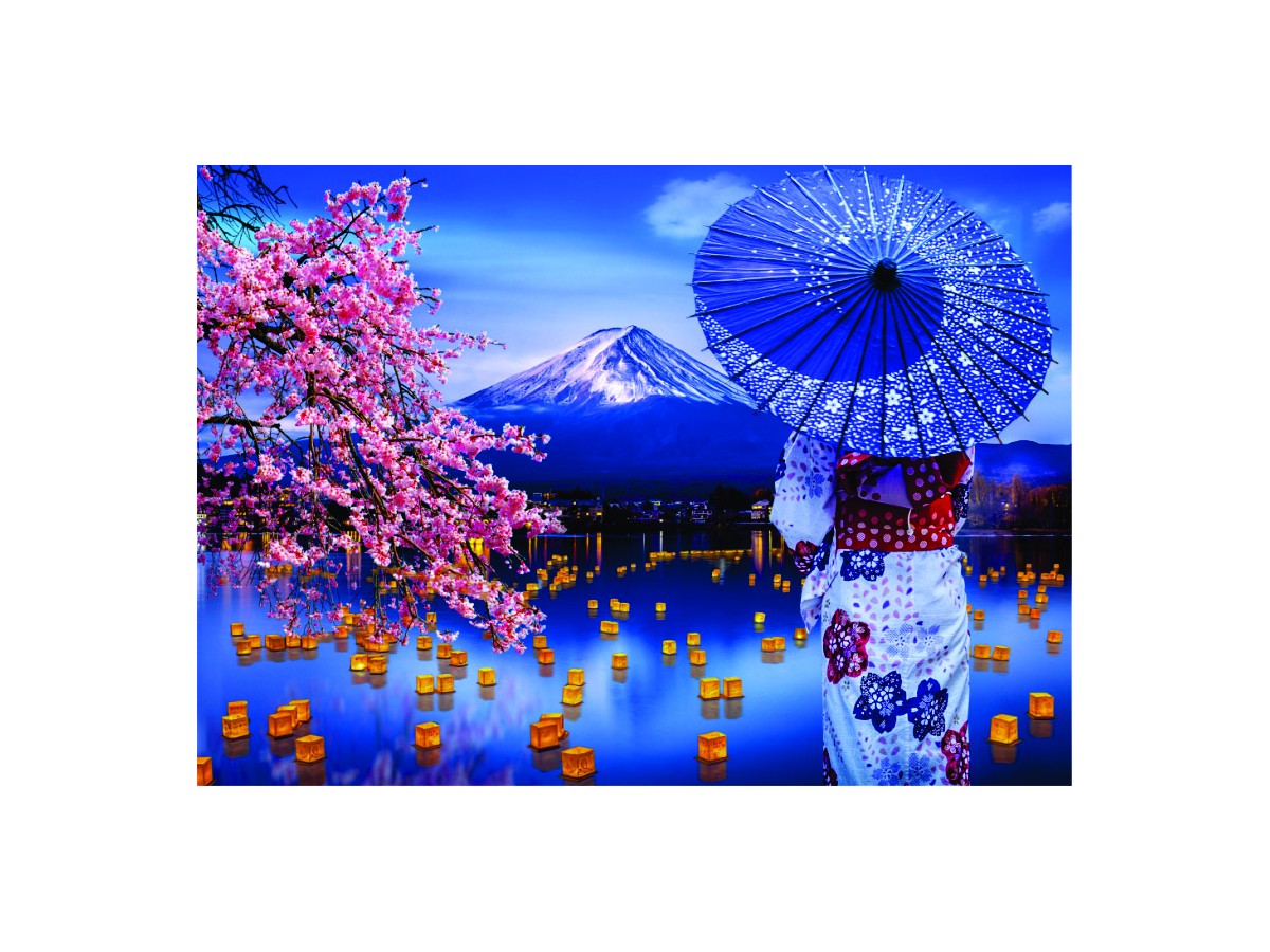 Imaginea acestui puzzle cu 1000 de piese de la brandul Roovi, surprinde esența tradițională a Japoniei printr-o ilustrație digitală vibrantă. Pe fundalul impresionant al muntelui Fuji, se desfășoară o scenă nocturnă plină de magie și serenitate.