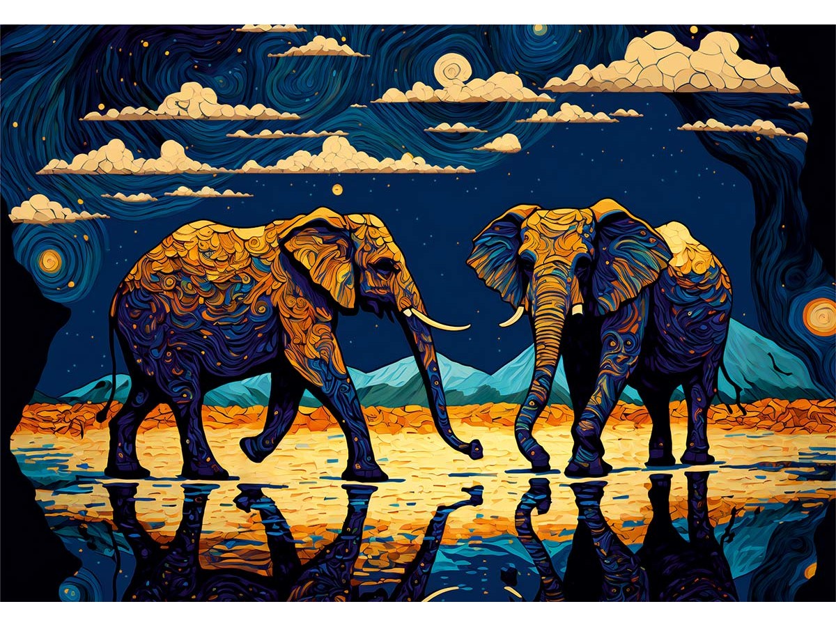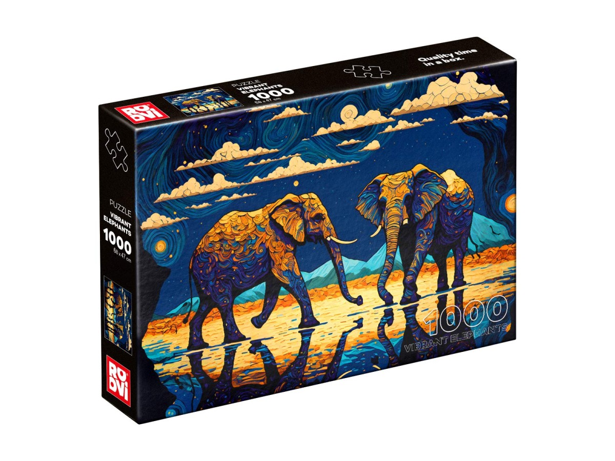 Imaginea acestui puzzle cu 1000 de piese Roovi - Vibrant Elephants (Roovi-81117) prezintă trei elefanți intens colorați pășind pe un teren uscat, sub un cer nocturn animat de nori și forme ondulate, care adaugă un element dinamic peisajului. Lucrarea de artă digitală este însuflețită de bogăția de texturi și culori vibrante utilizate pentru a reda formele elefanților, a cerului și a suprafeței apei ce reflectă fiecare detaliu. Detaliile ornamentale ale pielii elefanților sunt complementate de reflexia luminoasă a apei, creând o simetrie vizuală fascinantă. Universul exotic reprezentat este un amalgam între real și imaginar, stimulând contemplarea și introspecția.