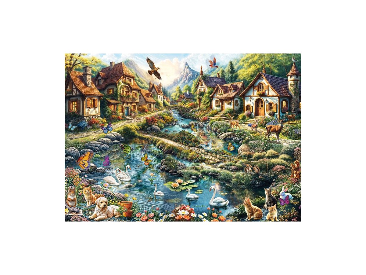 Imaginea dreptunghiulară prezintă o scenă idilică a unui sat situat la marginea unei păduri, realizată cel mai probabil prin tehnică de pictură. O compoziție bogată în detalii și coloristic vibrantă, ilustrația cuprinde mai multe căsuțe rustice cu acoperișuri din țiglă și fațade decorate cu lemn. Un râu curge prin centrul scenei, flancat de vegetație luxuriantă și animale sălbatice precum cerbi și vulpi. Diverse specii de păsări zboară deasupra apei sau stau pe maluri. Imaginea este plină de viață, fiecare element natural fiind redat cu o atenție deosebită la detaliu, reflectând armonia dintre natură și om.
