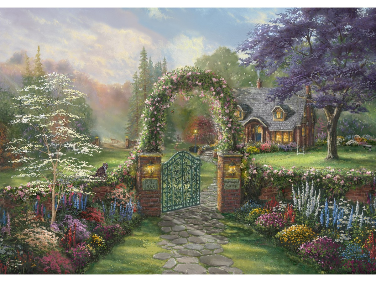 Acest puzzle 1000 piese Schmidt - Thomas Kinkade: Hummingbird Cottage (Schmidt-59940) te va purta într-o călătorie imaginară într-un peisaj de basm. Ilustrația detaliată, inspirată de opera lui Thomas Kinkade, surprinde o casă pitorească cu acoperiș înclinat, înconjurată de o grădină bogat decorată cu flori multicolore și copaci înfloriți. Drumul pavat și portalul de fier forjat, încadrate de arcul decorat cu flori, completează scenariul plin de căldură și intimitate.