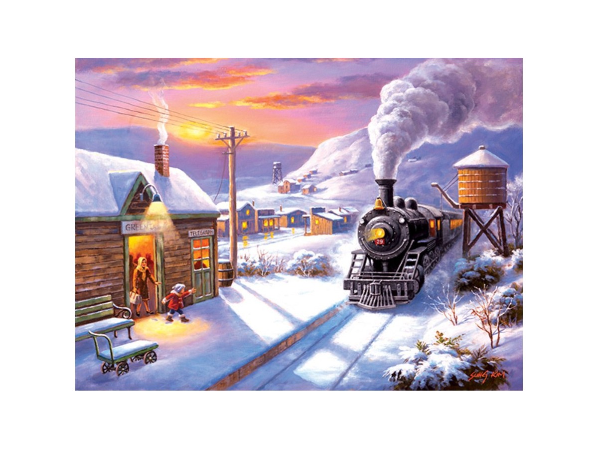 Puzzle-ul cu 1000 piese SunsOut - Sung Kim: Greenville Depot surprinde o scenă de iarnă la un depou de trenuri într-un peisaj zăpezit, ilustrată cu elemente realiste și lumini calde. Un tren cu aburi eliberează un nor dens de fum, pregătindu-se să părăsească stația 'Greenville', în timp ce două persoane, un adult și un copil, stau de vorbă lângă depou, aparent pregătindu-se pentru o călătorie. Detaliile pitorești, precum casele de lemn și turnul de apă, completează peisajul în culori vibrante care contrast cu zăpada albă.