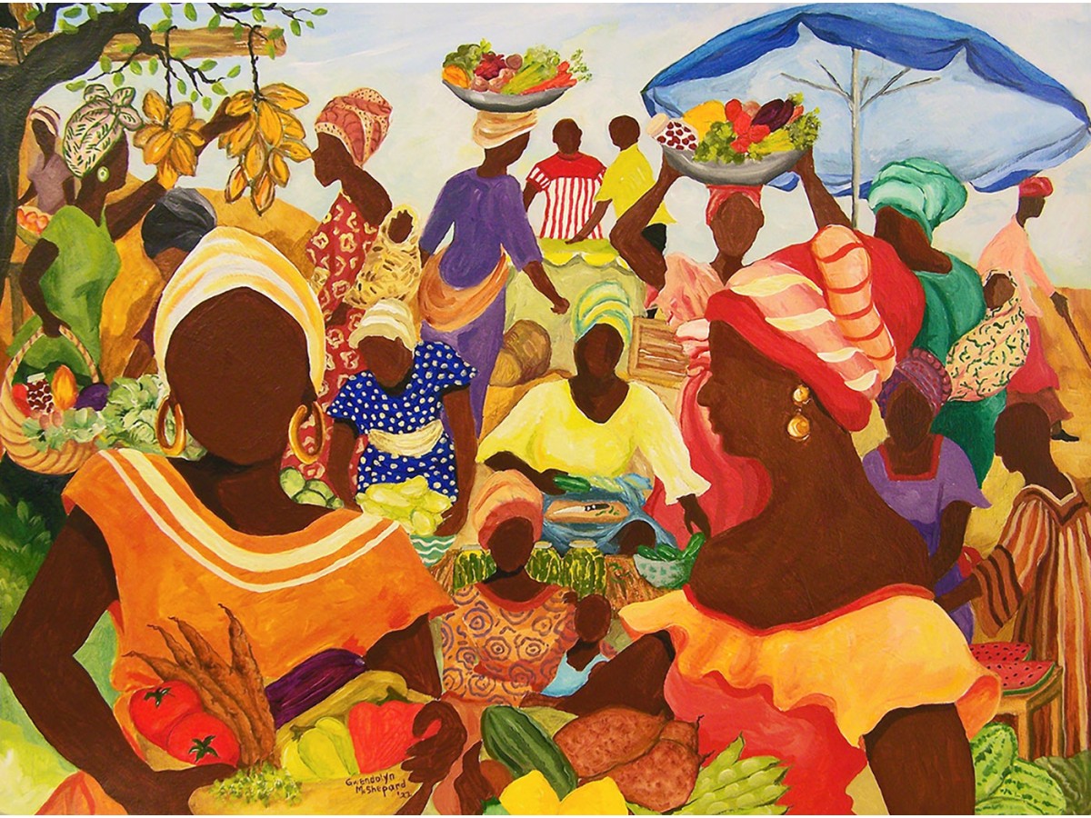 Imaginea puzzle-ului SunsOut To Market prezintă o piață vibrantă, plină de culoare, sub soarele arzător, probabil dintr-o locație africană, având în vedere stilul vestimentar tradițional și coșurile de pe capetele femeilor. Femeile, centrul acestei compoziții, sunt îmbrăcate în haine colorate și poartă diverse marfuri pe cap, de la fructe la legume, arătând o zi obișnuită de piață. Culorile vii, de la portocaliu la albastru intens, aduc o notă de autenticitate și energie scenei. Această pictură captează dinamica și aglomerația pieței, unde fiecare personaj pare să aibă povestea lui, contribuind la o compoziție plină de viață și mișcare.