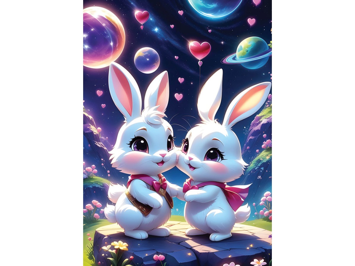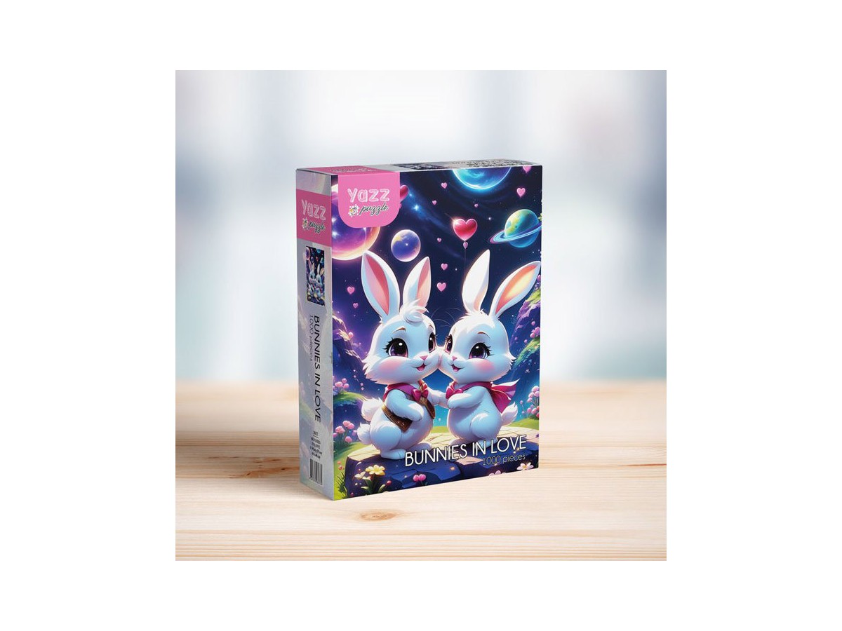 Imaginea puzzle-ului 1000 piese Yazz - Bunnies in Love prezintă doi iepurași antropomorfi, stând în picioare într-o scenă nocturnă de basm, sub un cer violet și stelat, cu planete și inimi plutind. Cei doi iepurași, ilustrați într-un mod animat, purtănd eșarfe roșii, unul având o geantă, sunt poziționați în fața unul altuia, ținându-și mâinile și privindu-se tandru, sugerând o temă de dragoste și afecțiune. Fundalul plin de detalii luminoase și colorate crează o atmosferă magică și onirică.