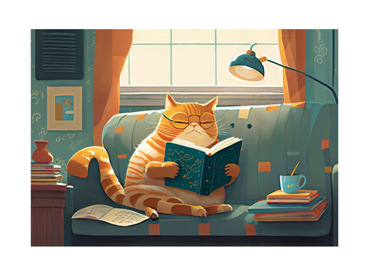 Imaginea acestui puzzle 1000 piese Yazz - Cat & Books (Yazz-3827) prezintă o ilustrație digitală colorată, care redă un motan portocaliu cu dungi albe, așezat comod pe o canapea albastră într-o cameră plină de lumină naturală. Motanul ține între labe o carte deschisă, având ochii închisi, sugerând că este cufundat în lectură sau poate chiar adormit. Pe fundal, pe lângă o ceașcă de cafea pe o măsuță mică, se observă mai multe cărți și o lampă de birou cu lumină caldă. Ambianța generală este una de calm și confort, cu detalii ademenitoare de viață casnică modernă.