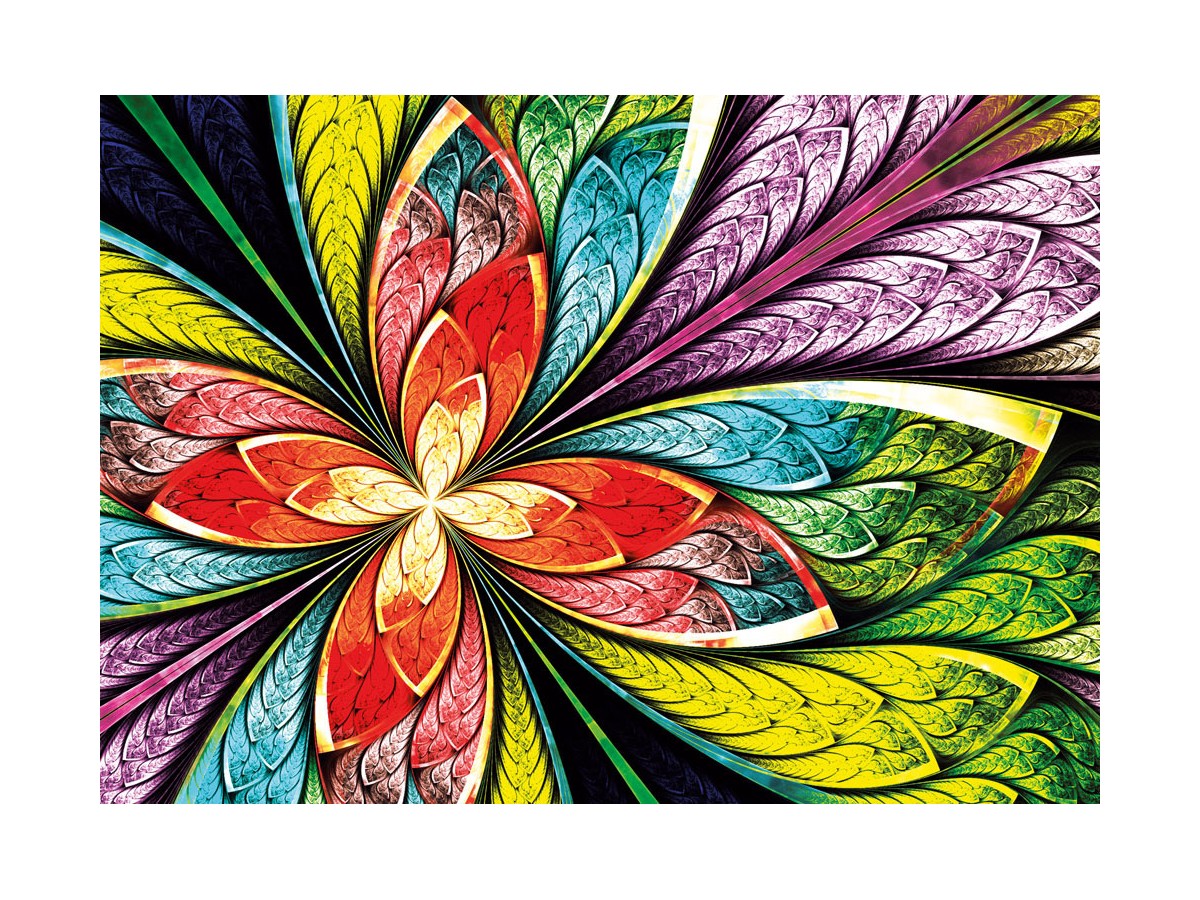 Imaginea puzzle-ului Yazz - Colorful Flower (Yazz-3815) prezintă o compoziție vibrantă și colorată, reprezentând o serie de forme asemănătoare frunzelor aranjate radial. Aceste forme sunt repetate în mod simetric și sunt colorate într-o varietate impresionantă de nuanțe, de la roșu la violet, trecând prin galben, verde, albastru și portocaliu. Fiecare 'frunză' pare să radieze dintr-un punct central, creând un efect de mandala. Aceasta este o ilustrație digitală datorită clarității și preciziei liniilor, și reușește să transmită un sentiment de ordine și armonie prin simetria și repetarea modelului.