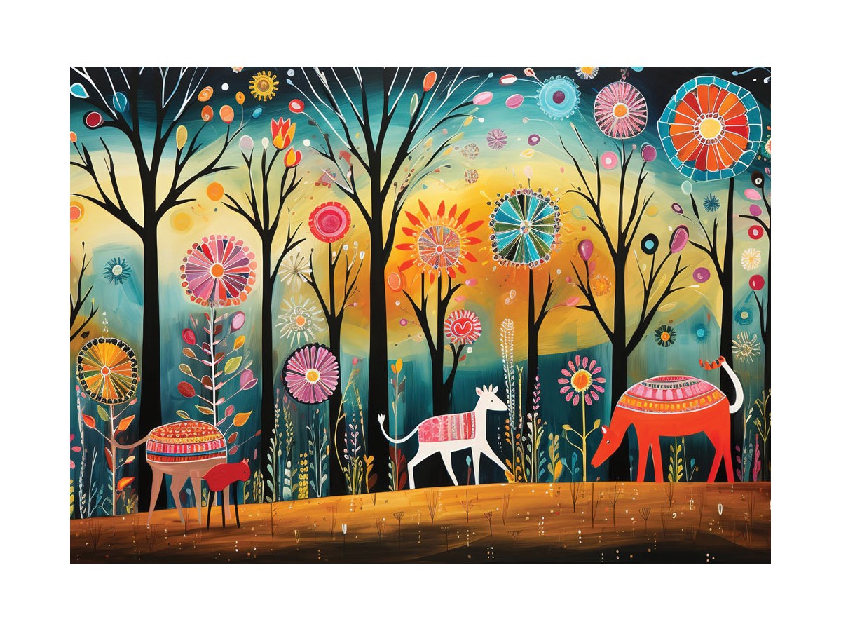 Acest puzzle 1000 piese Yazz - Colorful Forest (Yazz-3868) surprinde o ilustrație digitală vibrantă și plină de culoare, cu un peisaj dominat de arbori stilizați cu frunze și flori luminoase ce par să iradieze lumină. Copacii au trunchiuri negre și coroane bogate, pline de flori mari, rotunde și colorate, asemănătoare ornamentele folclorice. Sub acești copaci, pe un fundal de iarbă verde, apar trei animale stilizate: un cerb, un lup și un elefant, fiecare cu corpul decorat cu motive etnice și culori vibrante. O lume de basm, plină de energie și mister, prinde viață în această imagine fascinantă.