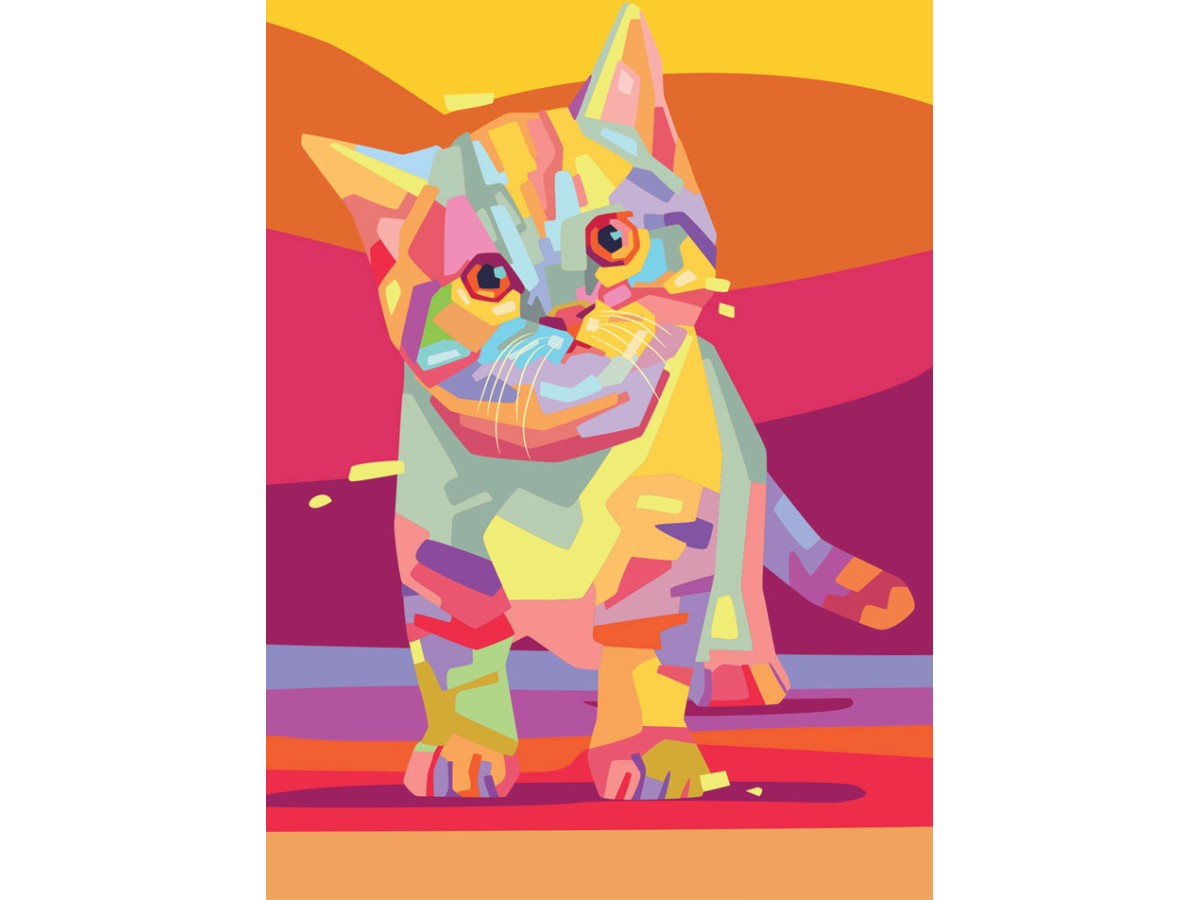 Imaginea ilustrează un pui de pisică, redat într-un stil vibrant și colorat, ce amintește de tehnicile cubismului. Dominată de forme geometrice, această reprezentare captează privirea prin contrastul puternic între culorile calde și reci, de la portocaliu aprins la albastru electric. Fundalul, împărțit în segmente colorate, contribuie la dinamismul și energia compoziției. Pictura digitală îmbină modernitatea cu un subiect adesea îndrăgit, animalele, și o prezintă într-o manieră neconvențională și atrăgătoare.